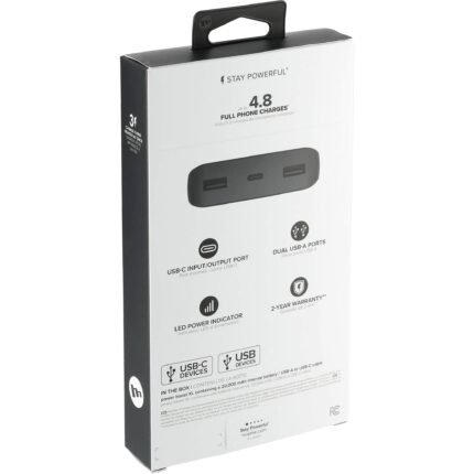 The mophie® Power Boost 20,000 mAh Power Bank has a rechargeable lithium polymer battery (74Wh) that can