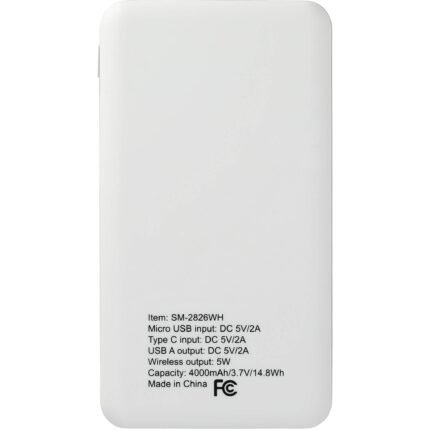 The 4000 mAh Cable Keeper Power Bank with Type-C Tip features a 4,000 mAh/14.8Wh rechargeable lithium polymer battery, an integrated
