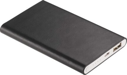 A leatherette cover adds a touch of sophistication to the UL Listed Abruzzo 4,000 mAh Power Bank,