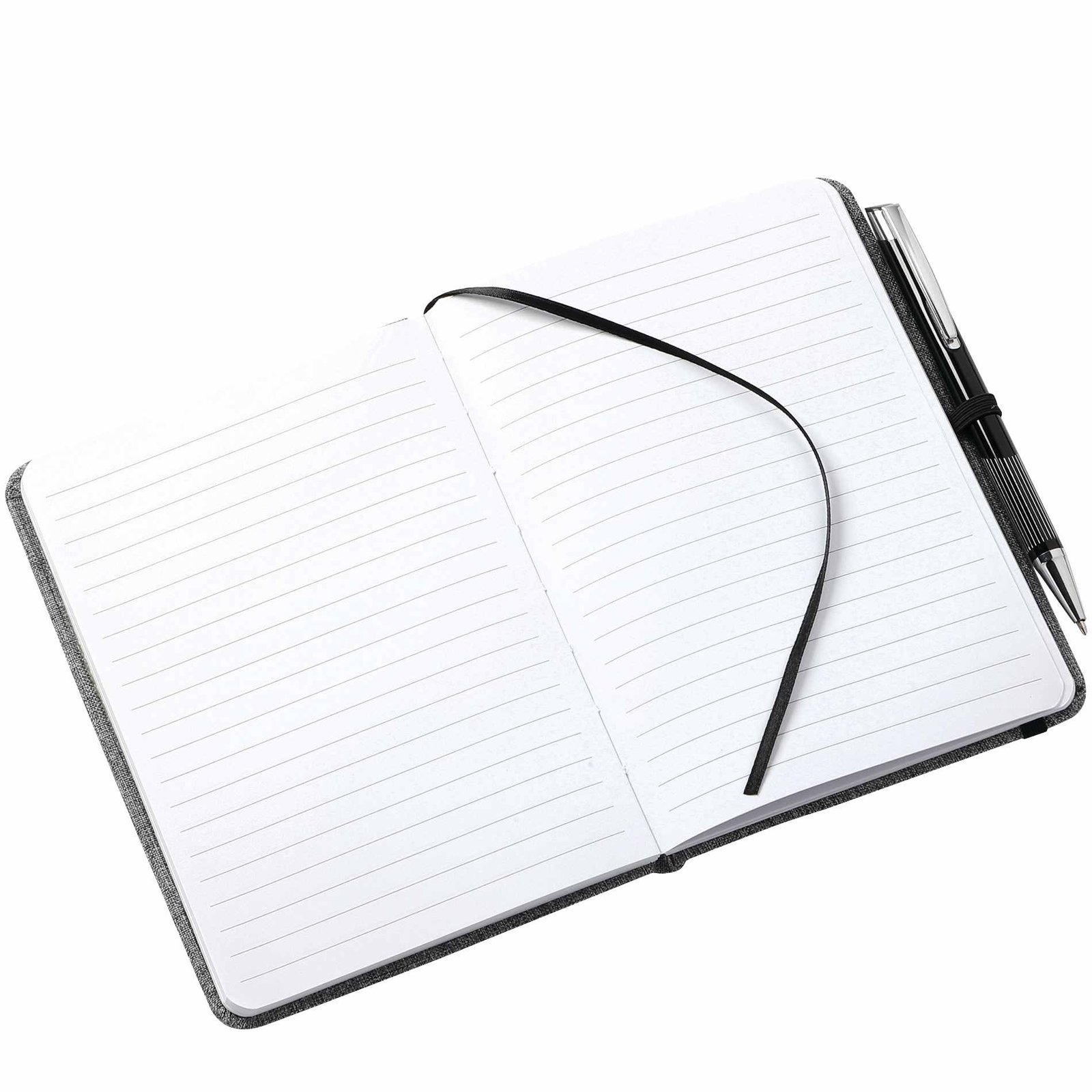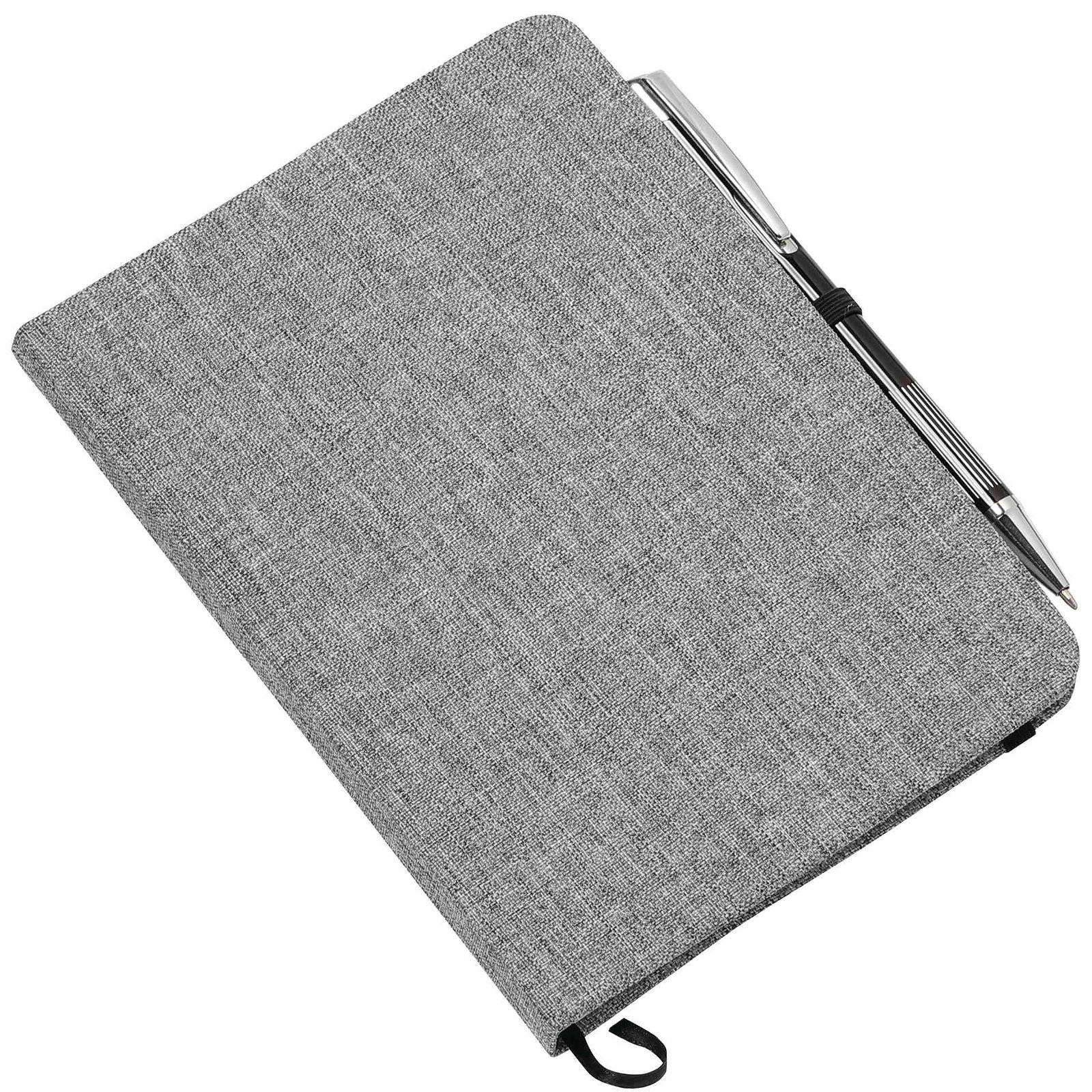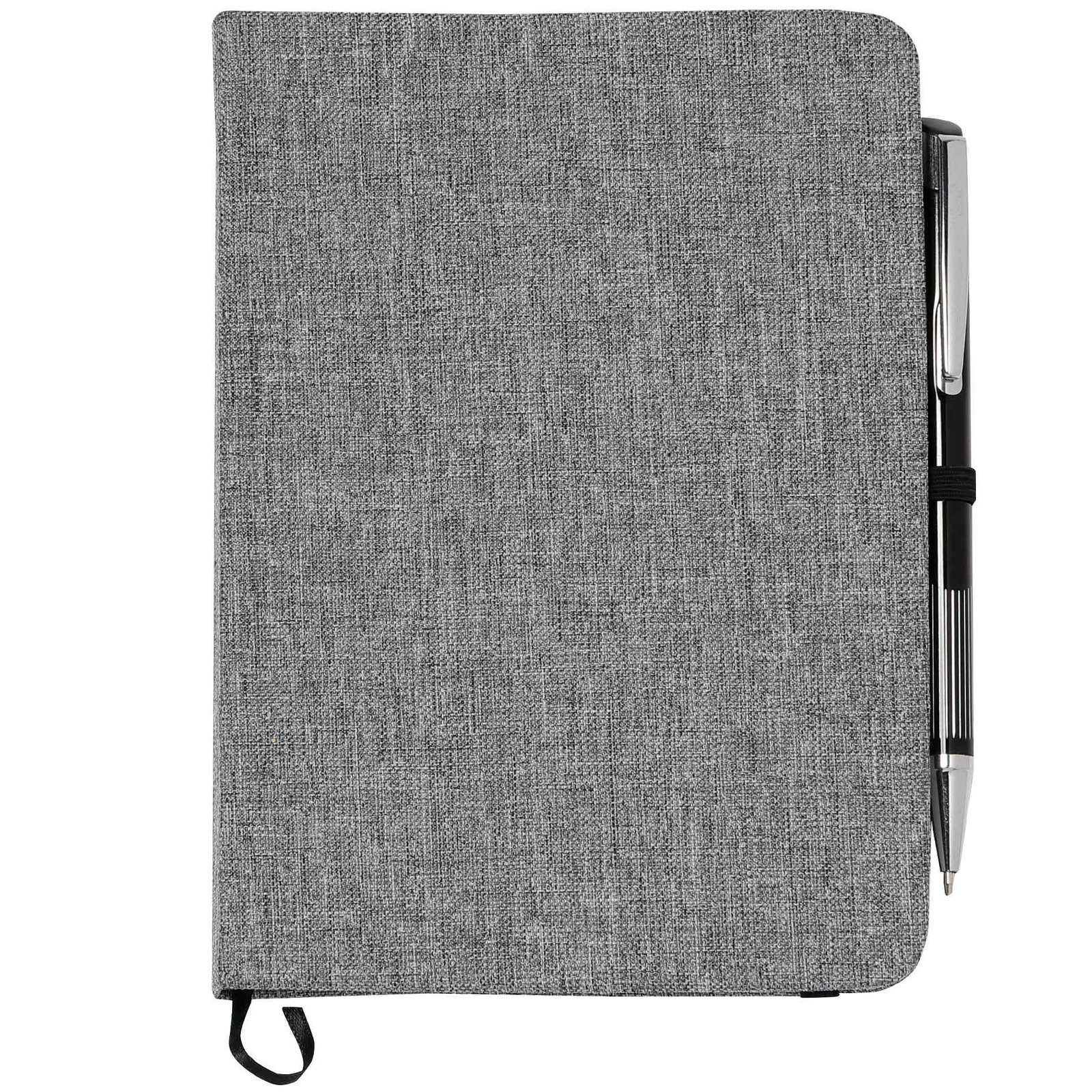 Keep track of all your important notes and ideas using the Bullet 5” x 7” FSC® Mix Heathered Bound Notebook, which features a built-in ribbon page marker to hold your place between uses. This heathered canvas covered bound notebook contains 80 sheets of white lined FSC® Mix paper and has a built-in stretchy pen loop for your favorite writing instrument. Pen not included. Key Features Material: Polyester Heathered canvas cover Sturdy bound design Contains 80 white lined sheets of paper Built-in elastic pen loop Convenient compact size