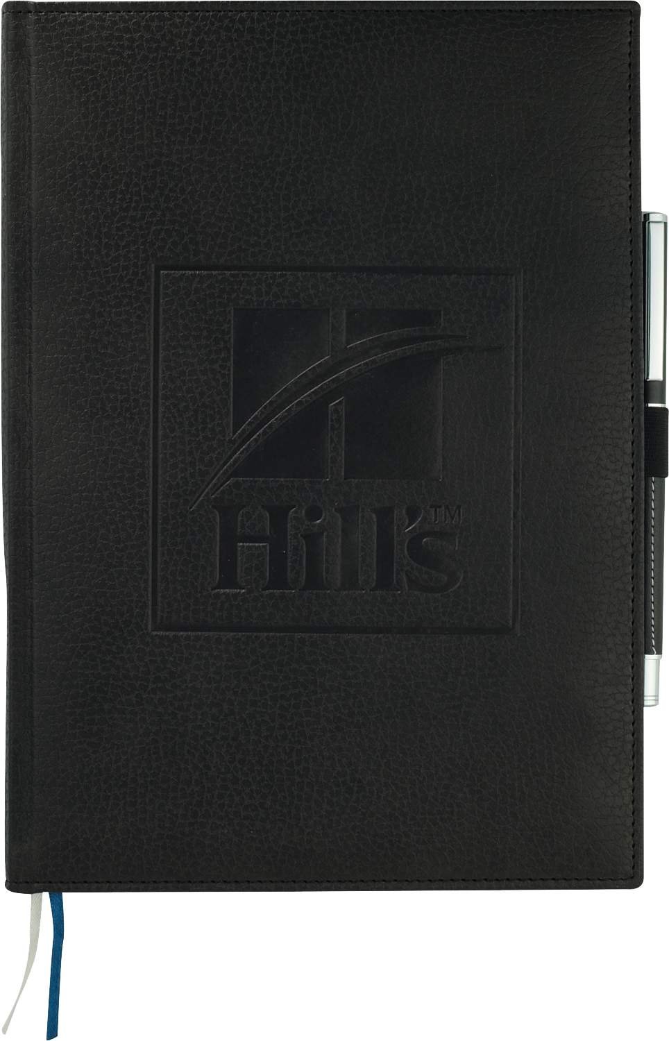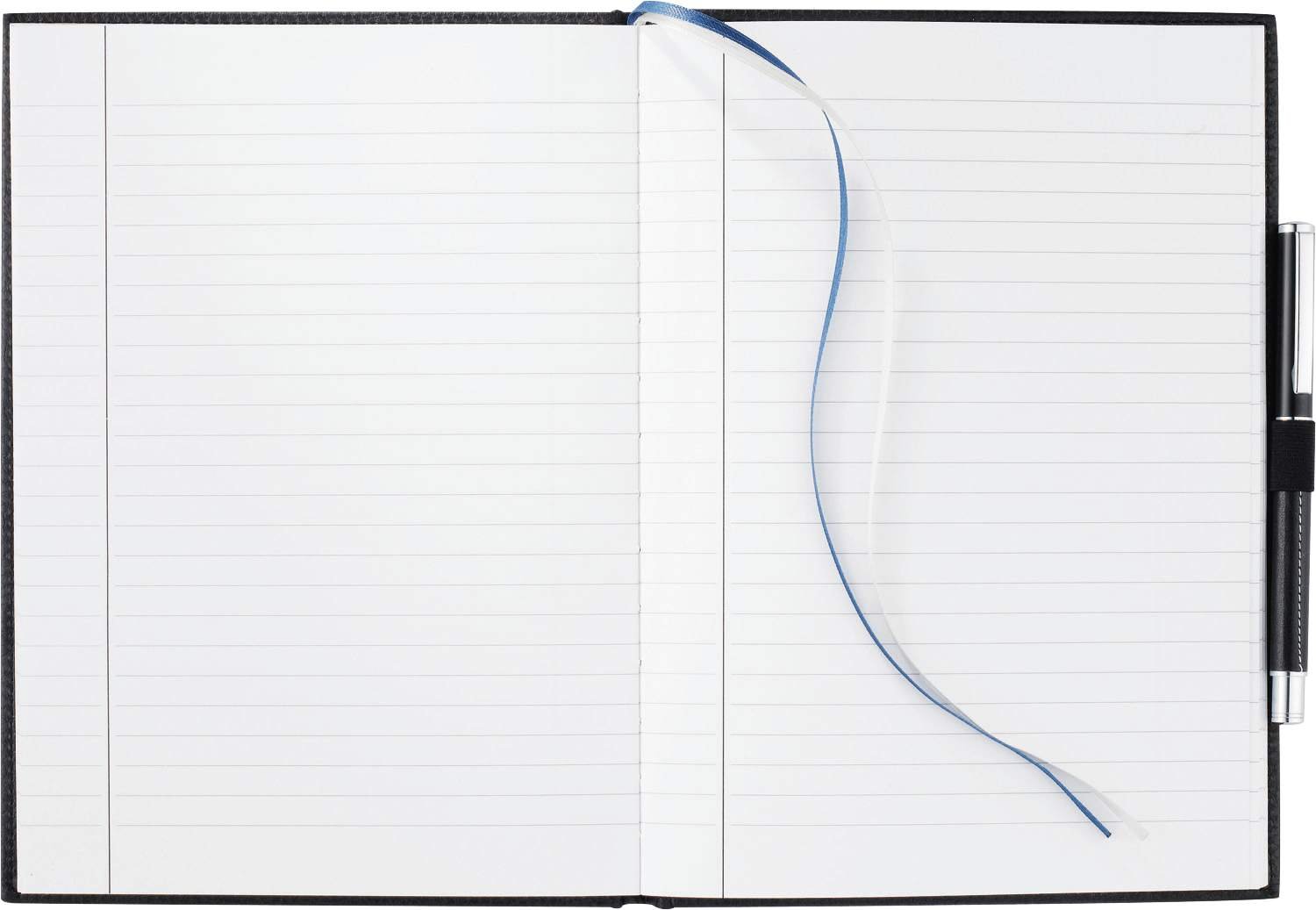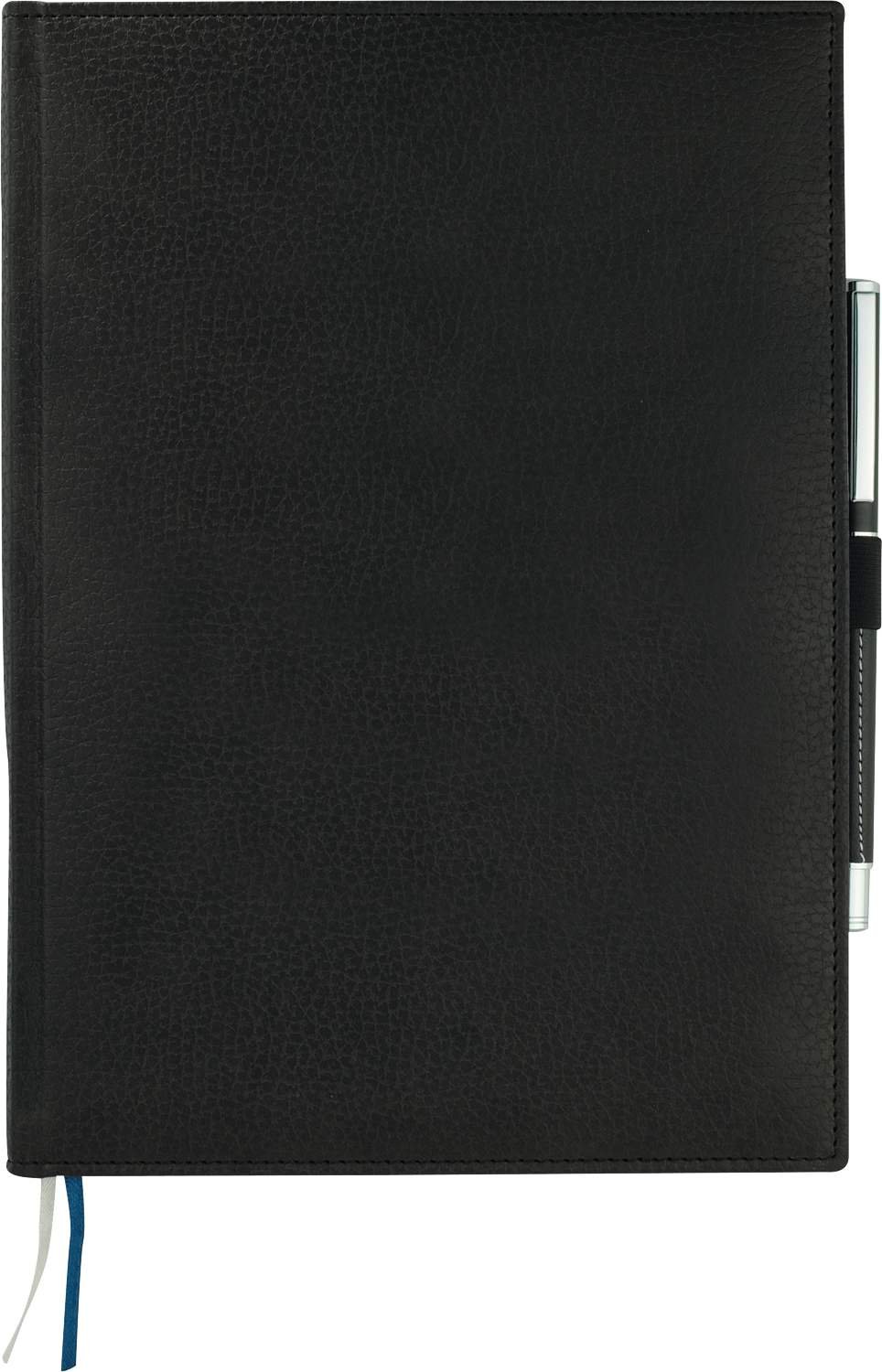 The 7” x 10” FSC® Mix Vicenza Large Bound Journal is a pebble-grain, hardcover bound journal containing 96 sheets of FSC® Mix white lined paper to record your notes and ideas. It includes a stretchy elastic pen loop, plus blue and silver ribbon page markers to hold your place with ease. Featuring Italian UltraHyde materials, the cover of this pebble-grain bound journal is both stylish and solidly constructed. Pen not included.