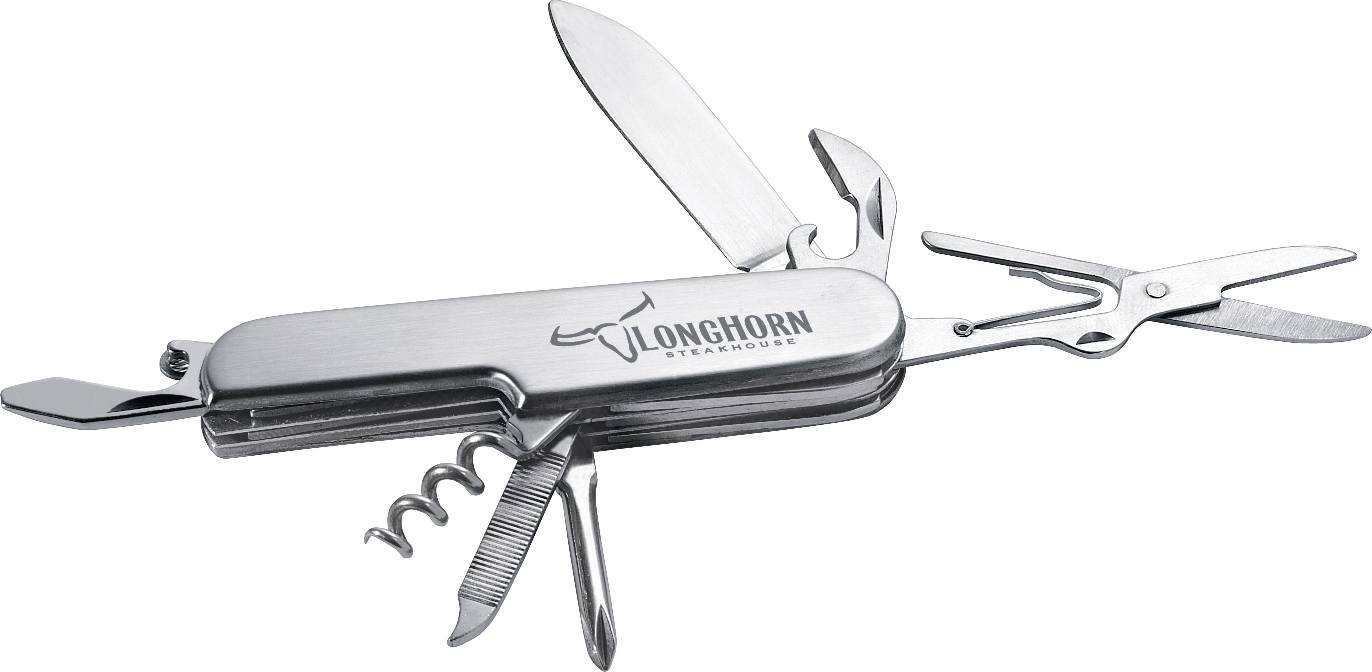 The 8-Function Stainless Steel Knife includes a knife, nail file, scissors, can opener, bottle opener/flat-head screwdriver, a Phillips-head screwdriver, a corkscrew and a mini metal split key ring. Key Features Material: Stainless Steel Stainless steel knife Flat-head and Phillips-head screw driver Can opener, bottle opener, and corkscrew Nail file and scissors Split metal key ring