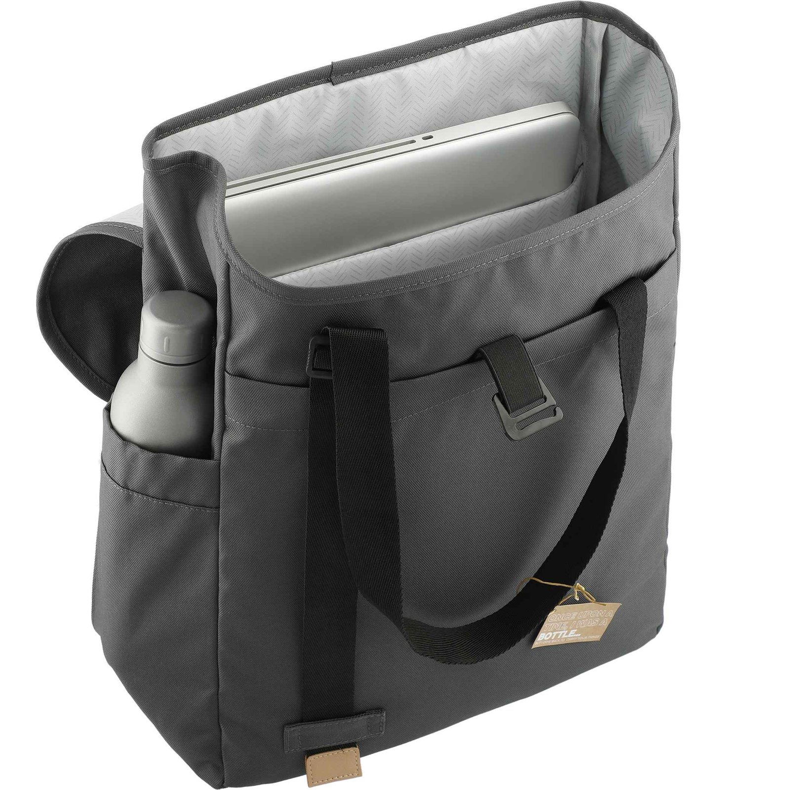 The Aft Recycled Computer Tote is made from eco-friendly RPET, so you can feel as good as you look while carrying it. Keep your essentials in the front zippered pocket and store your reusable water bottle in either of the side pockets. The main compartment features a padded 15” computer sleeve as well as a smaller padded sleeve for your tablet. Adjustable carry straps let you find the perfect length, and the easy-to-use G-hook secures the flap over the main compartment. Through a partnership with 1% For The Planet, one percent of sales of all EcoSmart® products are donated to environmental nonprofits.
