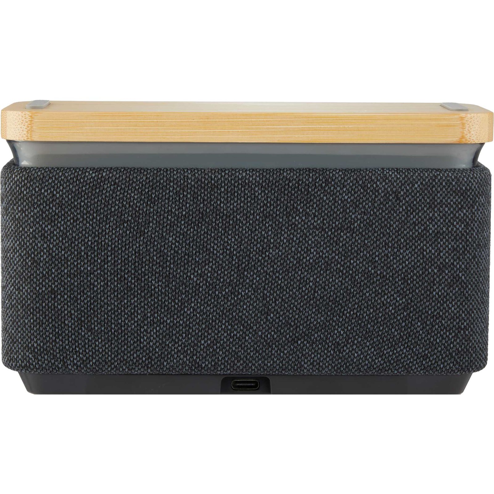 The Boost Fabric & FSC® Certified Bamboo Speaker with Wireless Charging Pad combines modern style with versatile performance. Designed for desks, countertops, or nightstands, it features an on-trend mix of natural FSC®-certified bamboo and RPET fabric with multi-color light accents for added visual appeal. The 5-watt speaker delivers clear, balanced sound, while the top doubles as a 10-watt wireless charging pad for compatible devices. The built-in 3000 mAh battery provides over 6 hours of playtime, and Bluetooth® 5.4 ensures a stable connection. For wireless charging, the speaker must be plugged in. Integrated controls and a built-in microphone make hands-free calls and music management easy. A 39” USB-A-to-Type-C charging cable is included. Each piece features a unique bamboo grain pattern, giving every speaker its own natural look. Key Features 5W speaker output – Delivers high-quality, crystal-clear sound 10W wireless charging pad – Charges compatible devices when plugged in 3000 mAh battery – Provides over 6 hours of playtime FSC®-certified bamboo top – Each piece has a unique natural grain RPET fabric wrap – Sustainable material with a modern look Multi-color light feature – Adds ambient illumination Bluetooth® version 5.4 – Reliable wireless connection Integrated music, light, and call controls – Easy hands-free operation Includes 39″ USB-A-to-Type-C charging cable