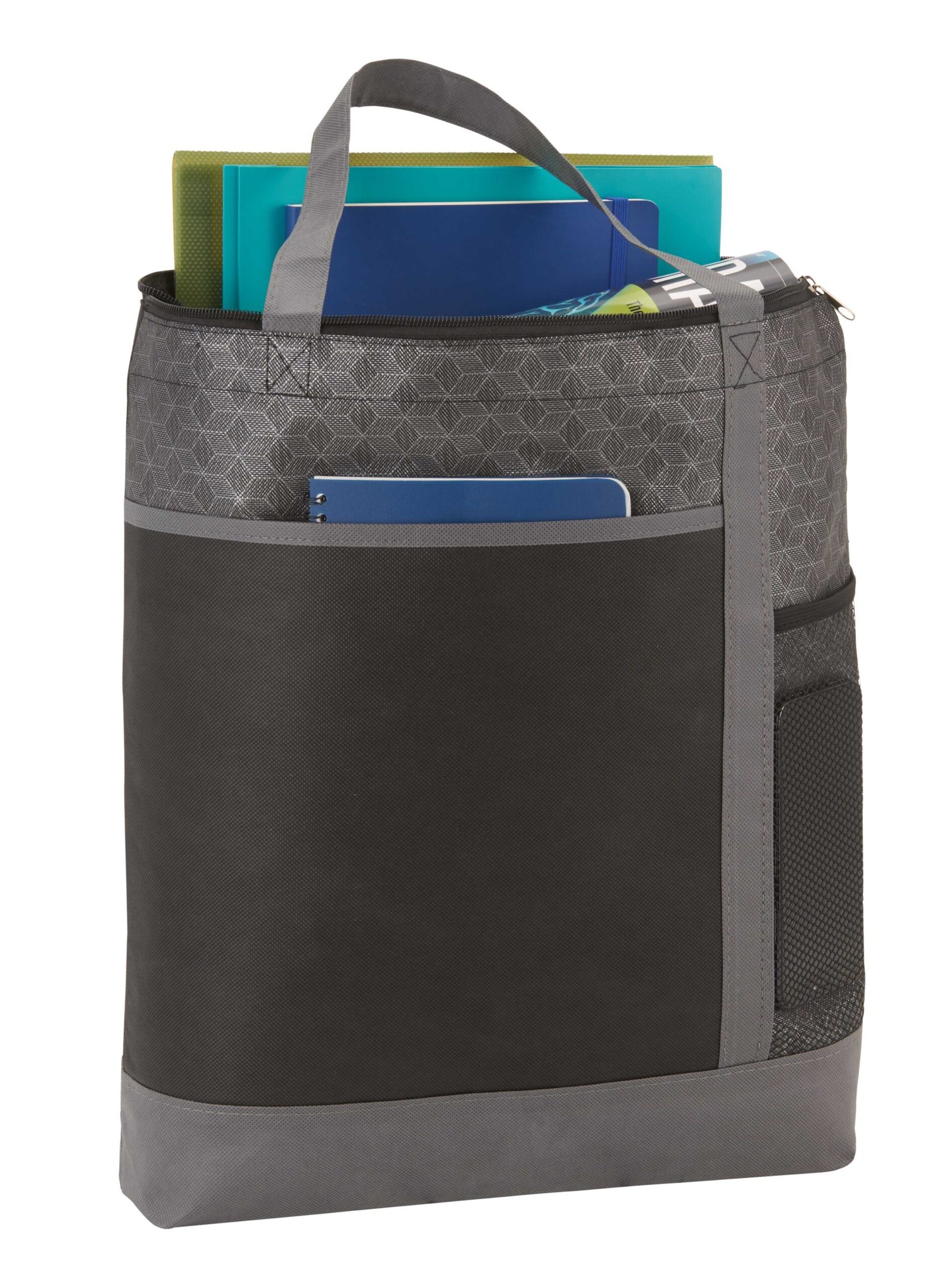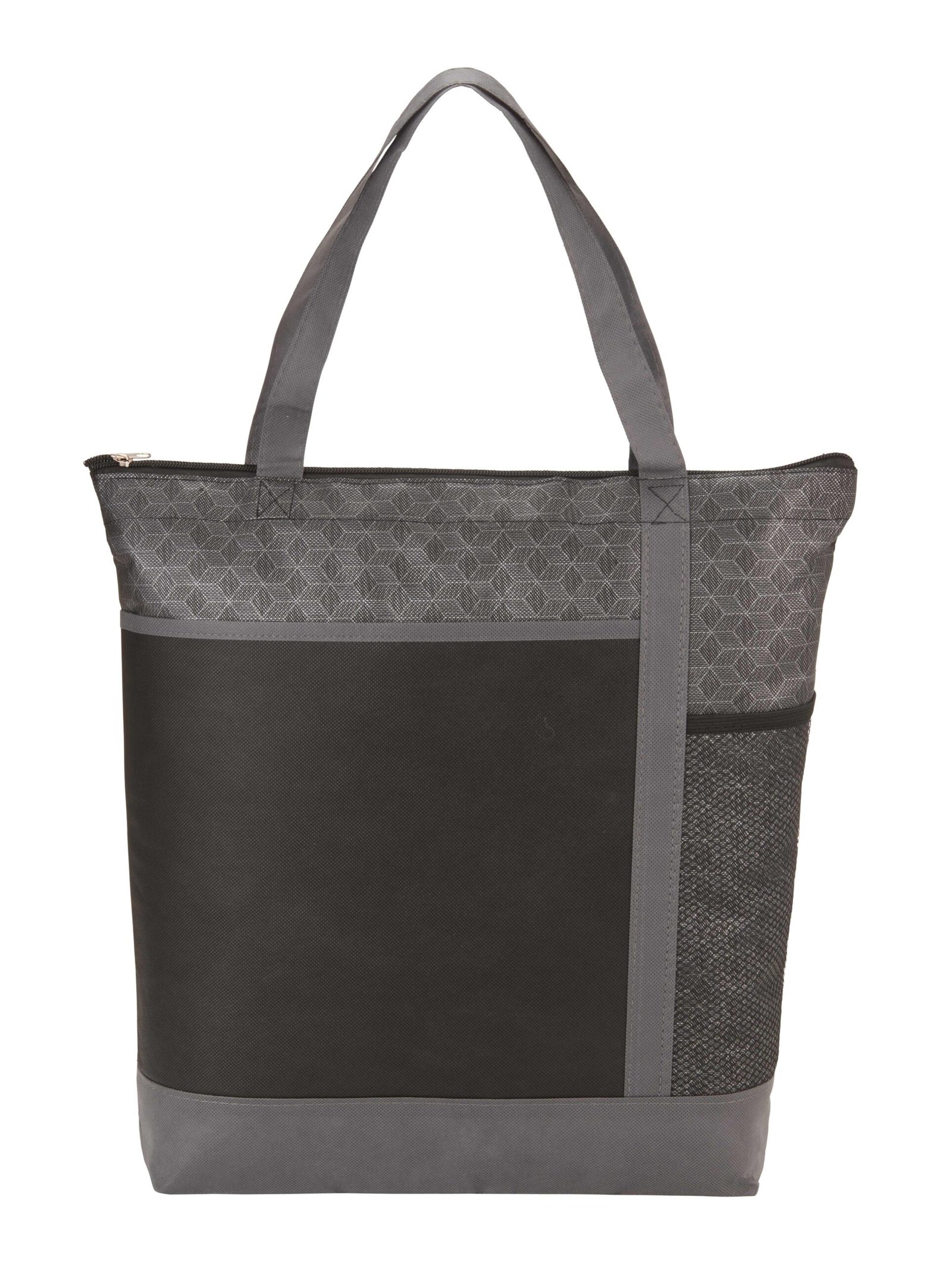 The Chrome Non-Woven Zipper Convention Tote is constructed from lightweight yet durable 80G polypropylene materials. It contains a spacious main compartment that zips shut to protect your belongings, plus a mesh side pocket perfect for storing cans or water bottles. This stylish non-woven tote bag is ideal for conventions, tradeshows, business meetings, and more. Key Features Material: 80G non-woven polypropylene Lightweight yet durable Roomy zippered main compartment Mesh side accent pocket perfect for holding water bottles Sturdy, comfortable handles