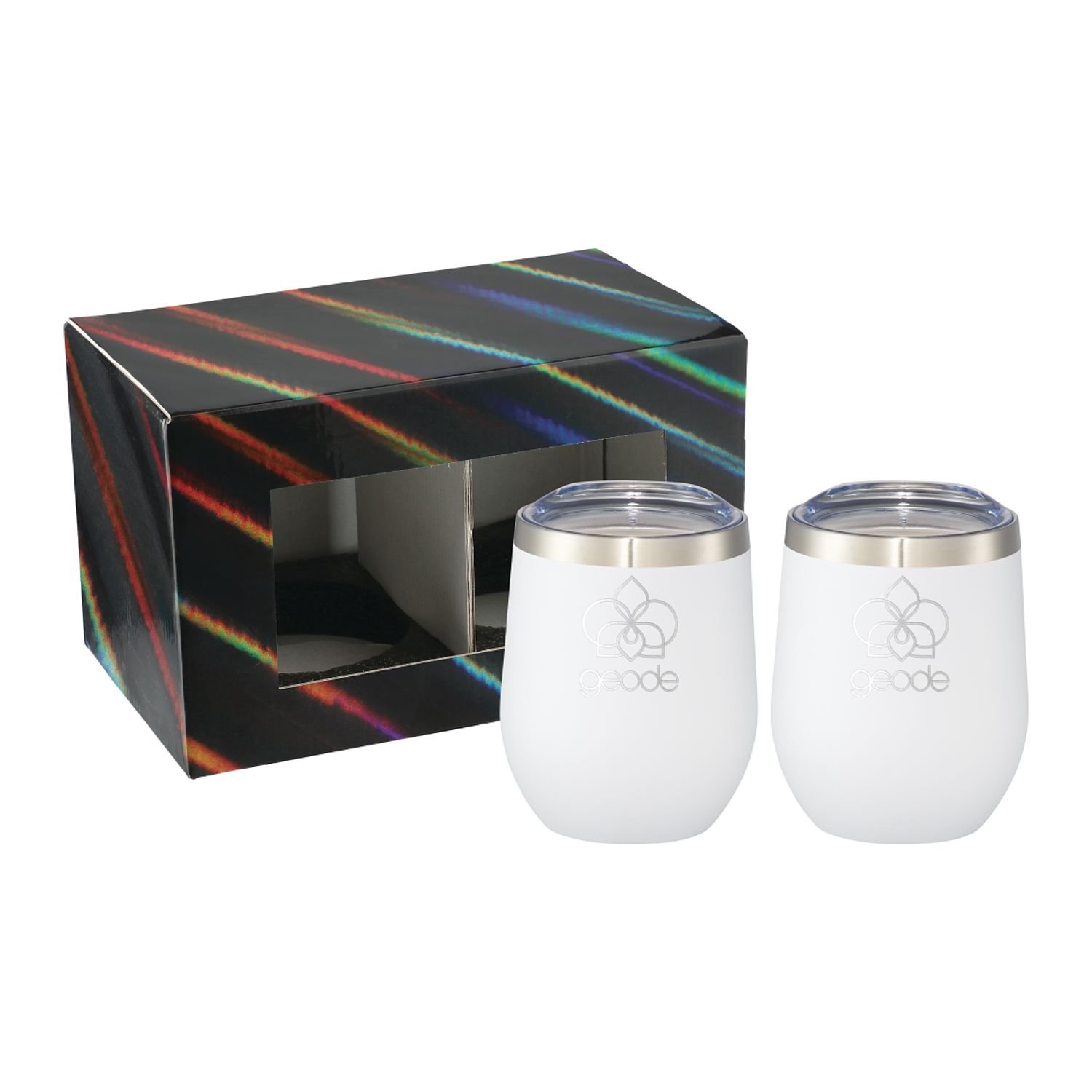 The Corzo Cup 12oz 2 in 1 Gift Set includes two 12oz Corzo Copper Vacuum Insulated Cups (1625-53). Each cup features double-wall stainless steel construction plus copper vacuum insulation, keeping your drink hot for up to 6 hours or cold for up to 24 hours. It has a durable powder coating to prevent exterior condensation, providing a comfortable grip. This two-piece set comes in a holographic gift box. Key Features Material: 18/8 grade stainless steel Includes 2 Corzo cups Double-wall construction and copper vacuum insulation Keeps drinks hot for up to 6 hours or cold for up to 24 hours Condensation-free powder coating is scratch- and fade-resistant Comes in holographic gift box packaging
