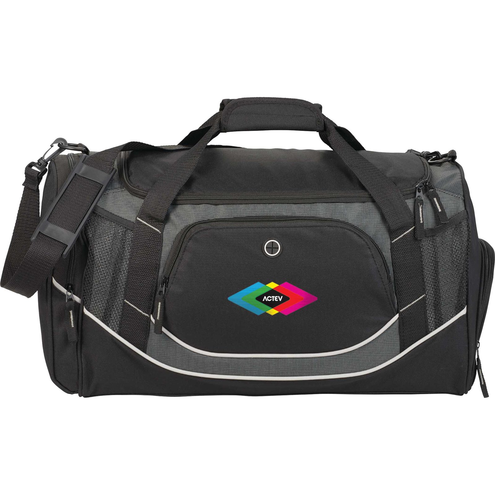 The Dunes 21″ Deluxe Sport Duffel Bag features a zippered U-shaped main compartment and two zippered side pockets (one with shoe pouch). This custom duffel bag includes a front zippered pocket with mesh accessory pockets and earbud port. The Dunes Deluxe Sport Duffel Bag includes two front mesh pockets, haul handle with comfort wrap, and detachable, adjustable shoulder strap. Key Features Zippered U-shaped main compartment 2 zippered side pockets (one with shoe pouch) Front zippered pocket with mesh accessory pockets and earbud port 2 front mesh pockets Haul handle with comfort wrap Detachable, adjustable shoulder strap