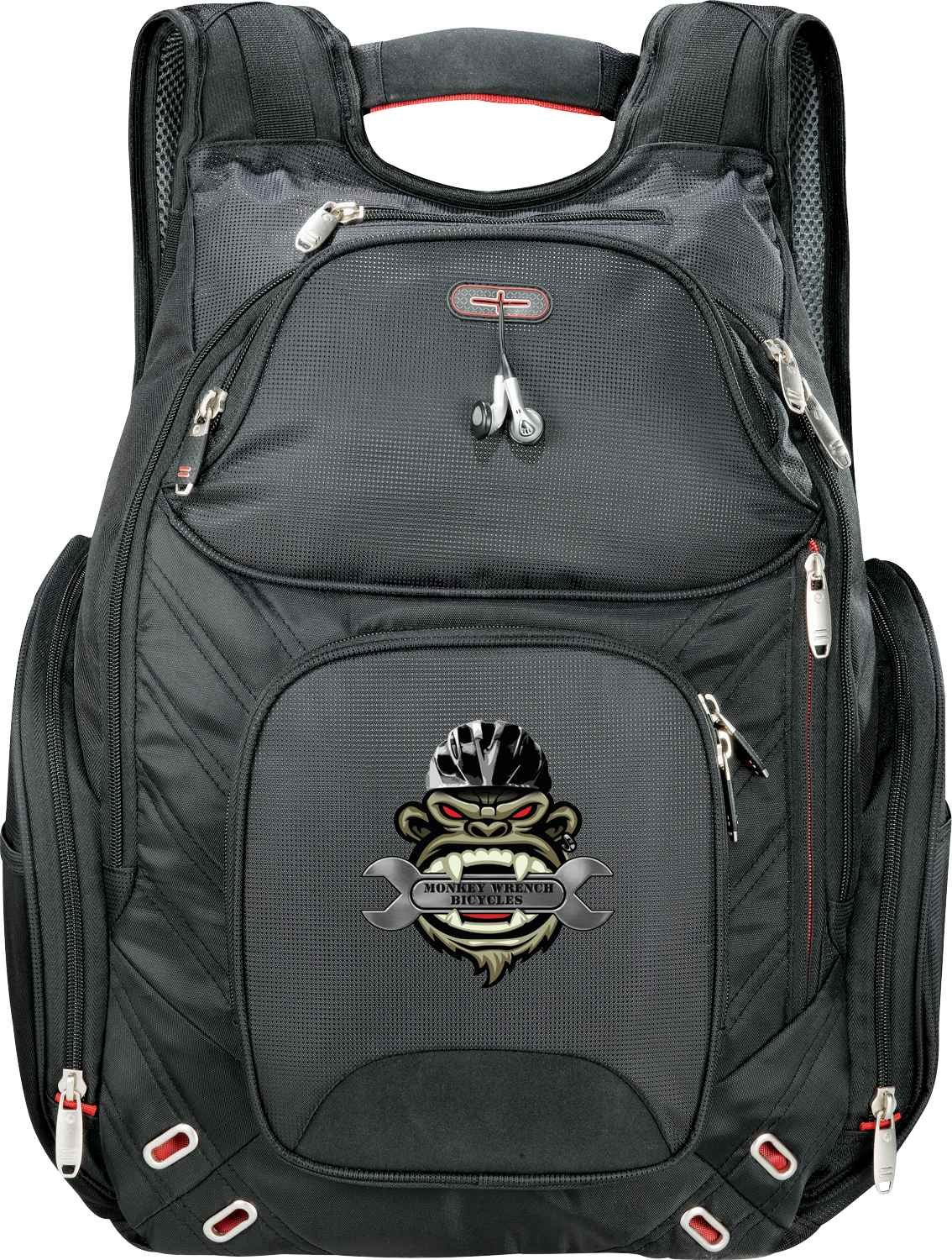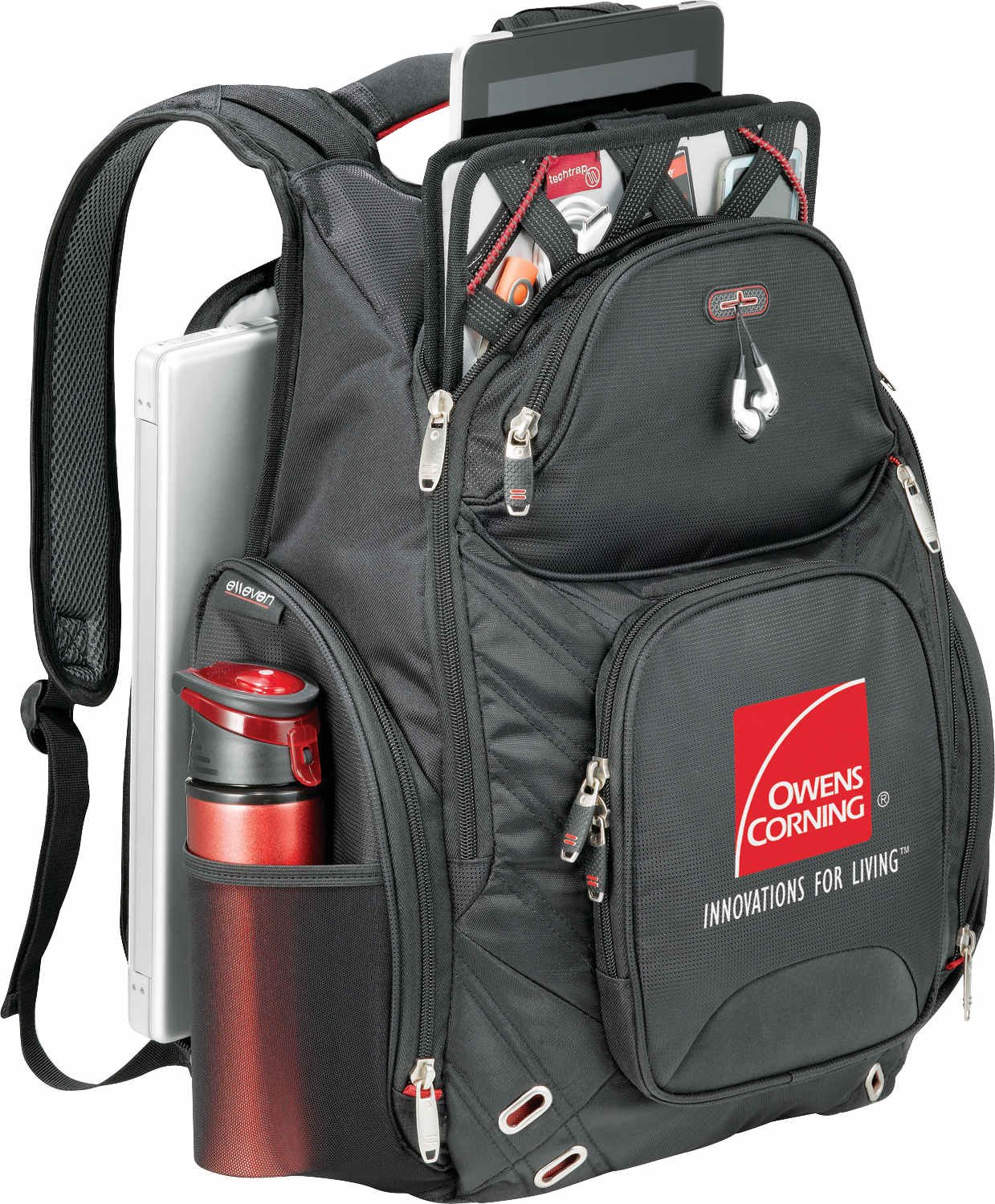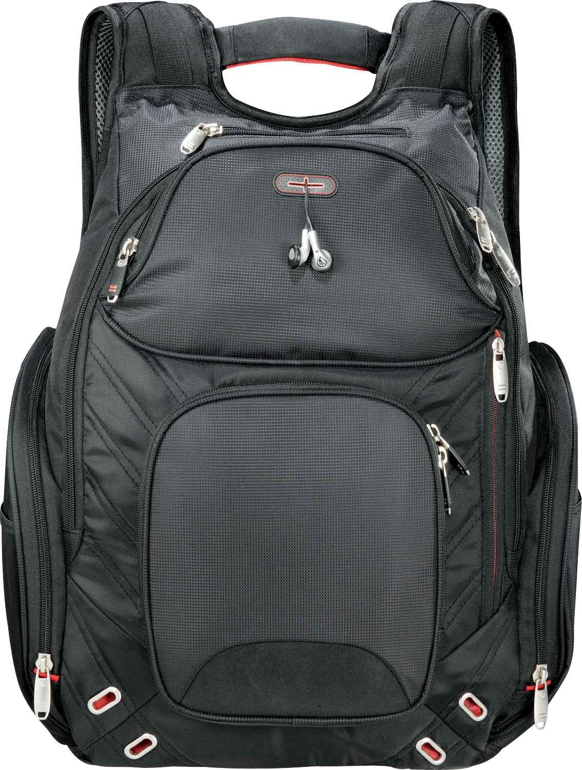 This exclusive design has a designated laptop-only section that unfolds to lay flat on the X-ray belt to increase your speed, convenience and security. Side entry laptop compartment holds up to 17” computer. Spacious main zippered compartment includes multiple slash pockets, a dedicated padded iPad pocket and removable techtrap iPad case and stand. Zippered nylex-lined pocket. Additional zippered media pocket with earbud port. Front zippered pocket with deluxe organization and key fob. Hidden pockets for valuables and easy-access pocket for tickets. Large zippered side pocket with attached ID window tag. PEVA insulated side pocket with exterior mesh pocket. Bottle opener/key fob on strap. Yoke-style handle. Padded back and compression shoulder straps for extra comfort. Back panel designed to slip over trolley handles. Signature elleven™ lining and hardware. Free run charges for embroidery up to 10,000 stitches.