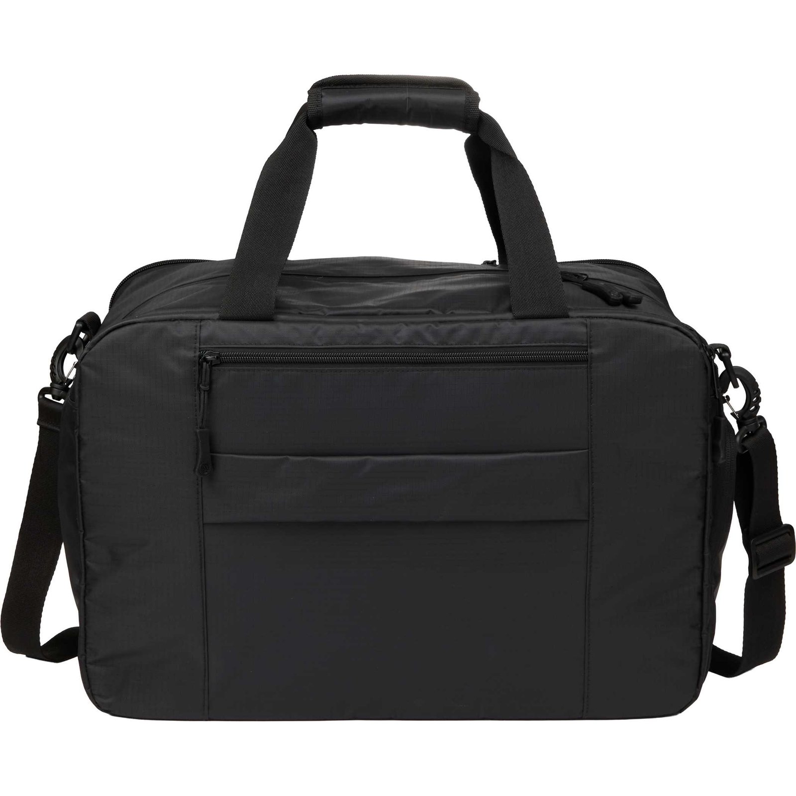 The Elleven Zenith Recycled 18″ Laptop Duffle Bag is a premium travel companion designed with organization, function, and sustainability in mind. Made with recycled materials, this versatile duffle features a padded laptop compartment for laptops up to 18-inches, a trolley sleeve, and multiple storage zones to keep everything in place. The front includes a large zippered pocket with built-in organization, plus a secondary pocket on the left side ideal for water bottles or other quick-access items. A dedicated shoe compartment keeps footwear separate from clean gear, making this the perfect all-in-one solution for work trips or weekend getaways. By choosing this duffle, you’re making a positive impact on the environment through a partnership with 1% For The Planet, as a portion of each sale supports environmental nonprofits. Key Features Padded laptop sleeve – Holds most 18″ laptops or tablets, ideal for travel and commuting Zippered shoe compartment – Keeps shoes or gym gear separated from clean items Trolley pass-through sleeve – Slides easily over rolling luggage for smooth airport transfers Crafted with recycled fabric – Made with materials that reduce waste and support sustainability Front zippered pocket with built-in organization – Stores cords, pens, and small accessories with ease Side bottle sleeve – Fits most standard water bottles or compact umbrellas Light padding throughout – Offers extra protection and structure without added weight Durable webbed handles – Comfortable to carry by hand or over the shoulder Adjustable, removable shoulder strap – Wear crossbody or over-the-shoulder with padded comfort Modern matte hardware and tonal branding – Delivers a polished, understated look for any setting