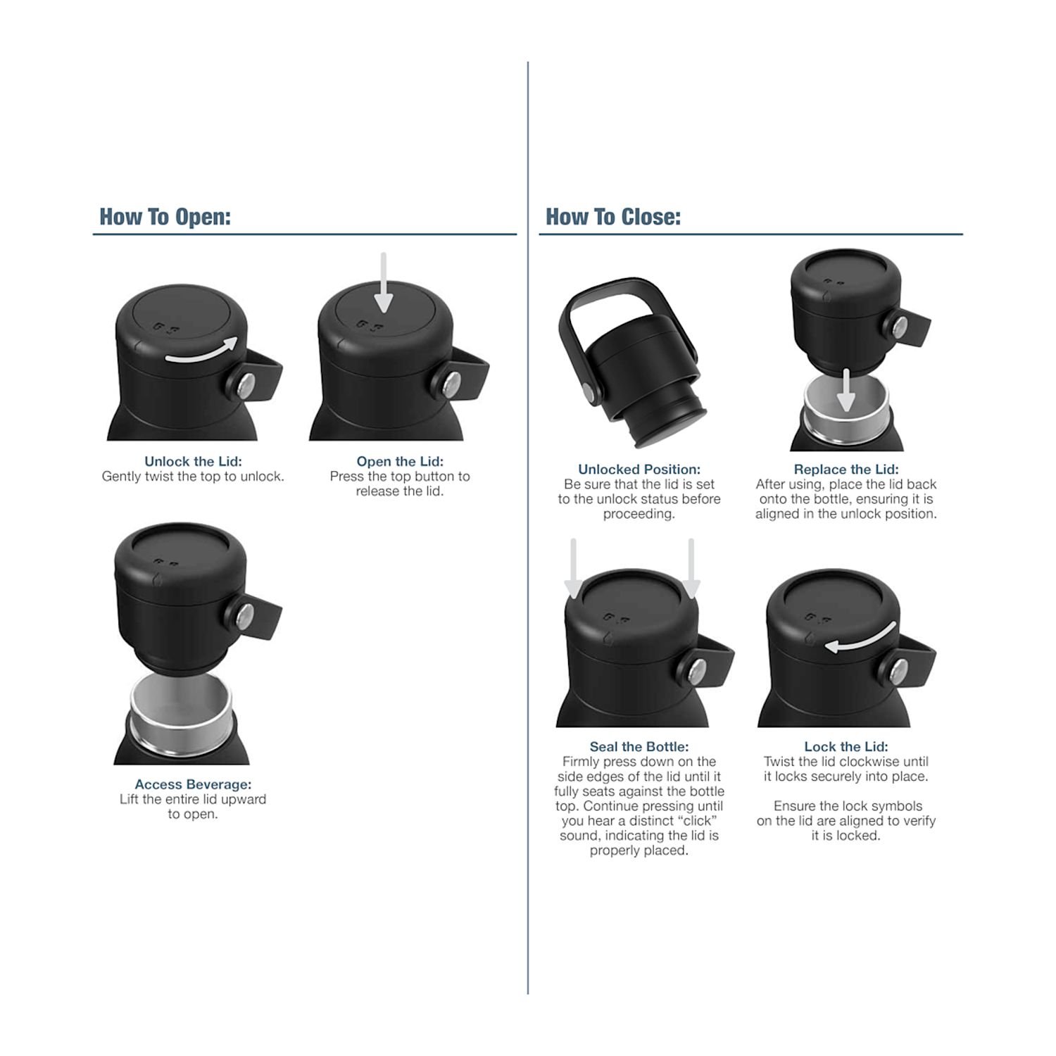 - Leakproof with lock feature – simply place the lid on the bottle, press top button to secure, and twist the lid to lock