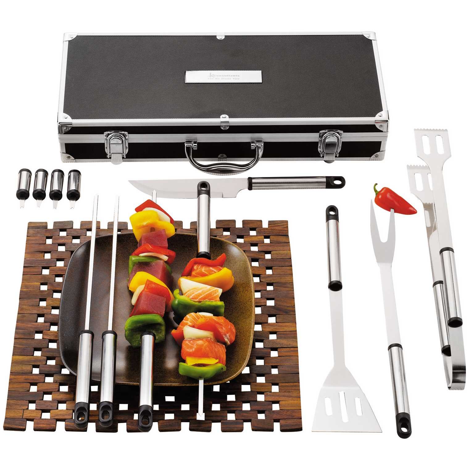 The Grill Master 13-Piece BBQ Set has everything you need to elevate your outdoor grilling game. Perfect for steaks, burgers, hot dogs, veggie kabobs, shrimp skewers, and more, this complete BBQ kit is great for gifting or treating yourself. The set includes essential grilling tools—four skewers, four corn holders, one spatula, one serving fork, one knife, and tongs—all neatly organized in a durable, aluminum-accented carrying case. Each item fits securely in its designated space, helping keep everything organized and protected. The sturdy case handle and clasps make it easy to transport your tools to your backyard, campsite, or tailgate party. Note: Do not expose handles to direct heat. Key Features Includes: Four skewers, four corn holders, one spatula, one serving fork, one knife, and one set of tongs Aluminum-accented carrying case – organizes and protects tools when not in use Items are secured neatly inside the case – ensures everything stays in place during transport Sturdy case handle and clasps – for easy carrying and secure closure Perfect for outdoor grilling – ideal for meats, veggies, and more Great gift idea – perfect for company events, raffles, or holiday gifts Why We Love It A complete grilling set in a sleek carrying case—perfect for backyard BBQs, campsite cookouts, or tailgate takeovers. How To Sell It Packed with all the essentials and housed in an organized case, this set makes a standout gift for company events and summer promotions. View Sell Sheet and Assets