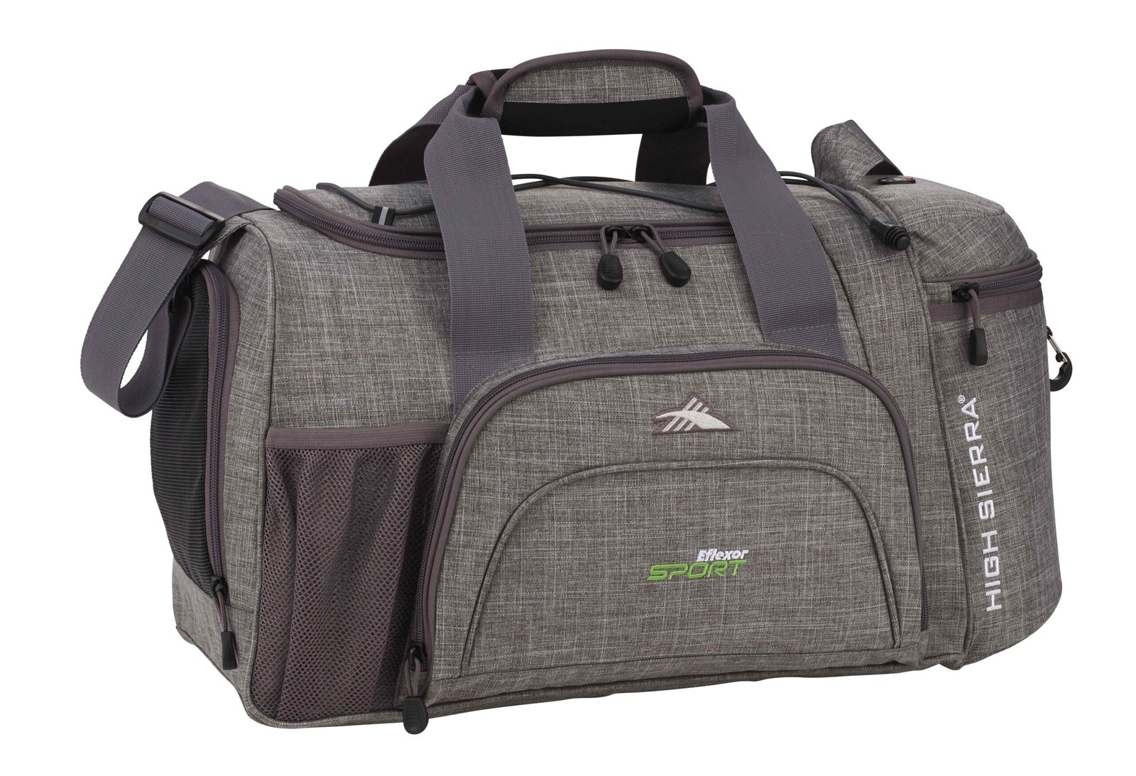 The High Sierra Switch Blade Sport Duffel Bag includes a large main compartment with U-shaped opening and an end media pocket with a headphone port. Store wet clothes in the mesh wet compartment, which rolls up when not in use. This sport duffel includes a zippered front pocket and elastic shock cord and large clip to attach extra gear. The High Sierra Switch Blade Sport Duffel Bag is easy to carry with an adjustable shoulder strap and includes a lifetime warranty. Key Features 600d PolyCanvas and RipStop Nylon Large main compartment with U-shaped opening, end media pocket with headphone port Roll-up mesh wet compartment Elastic shock cord and clip to attach extra gear Adjustable shoulder strap Lifetime warranty