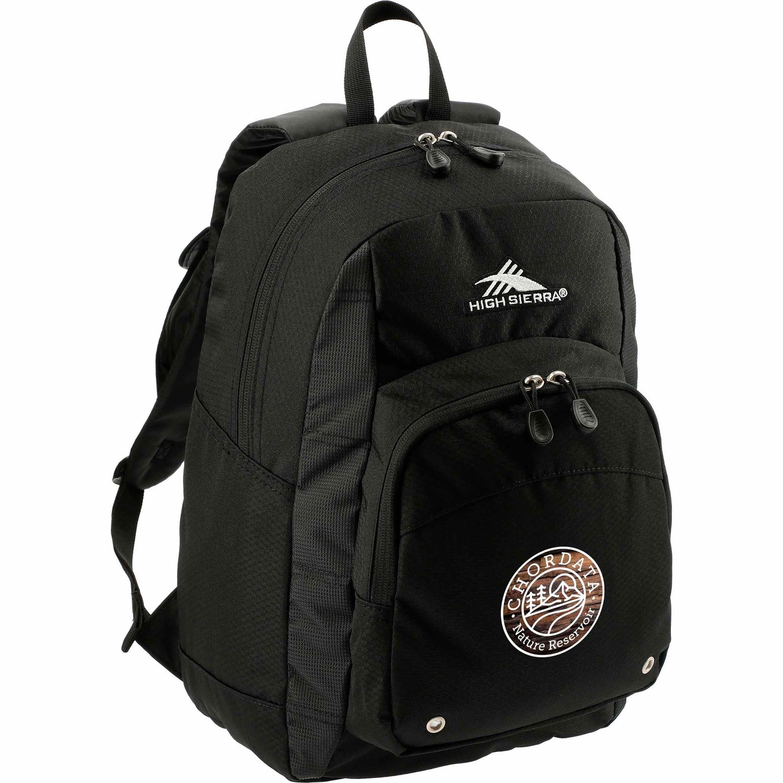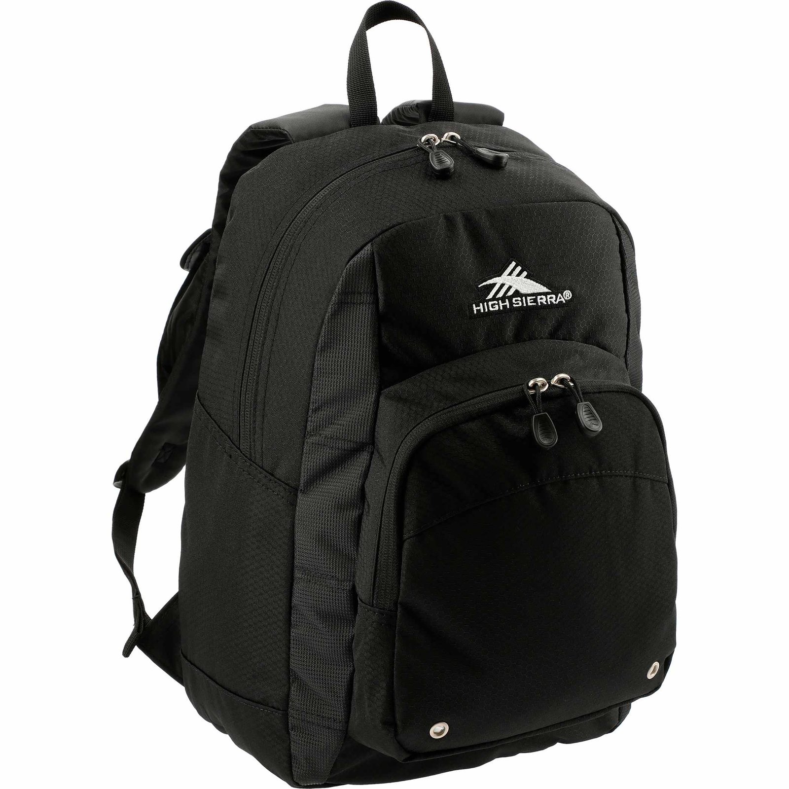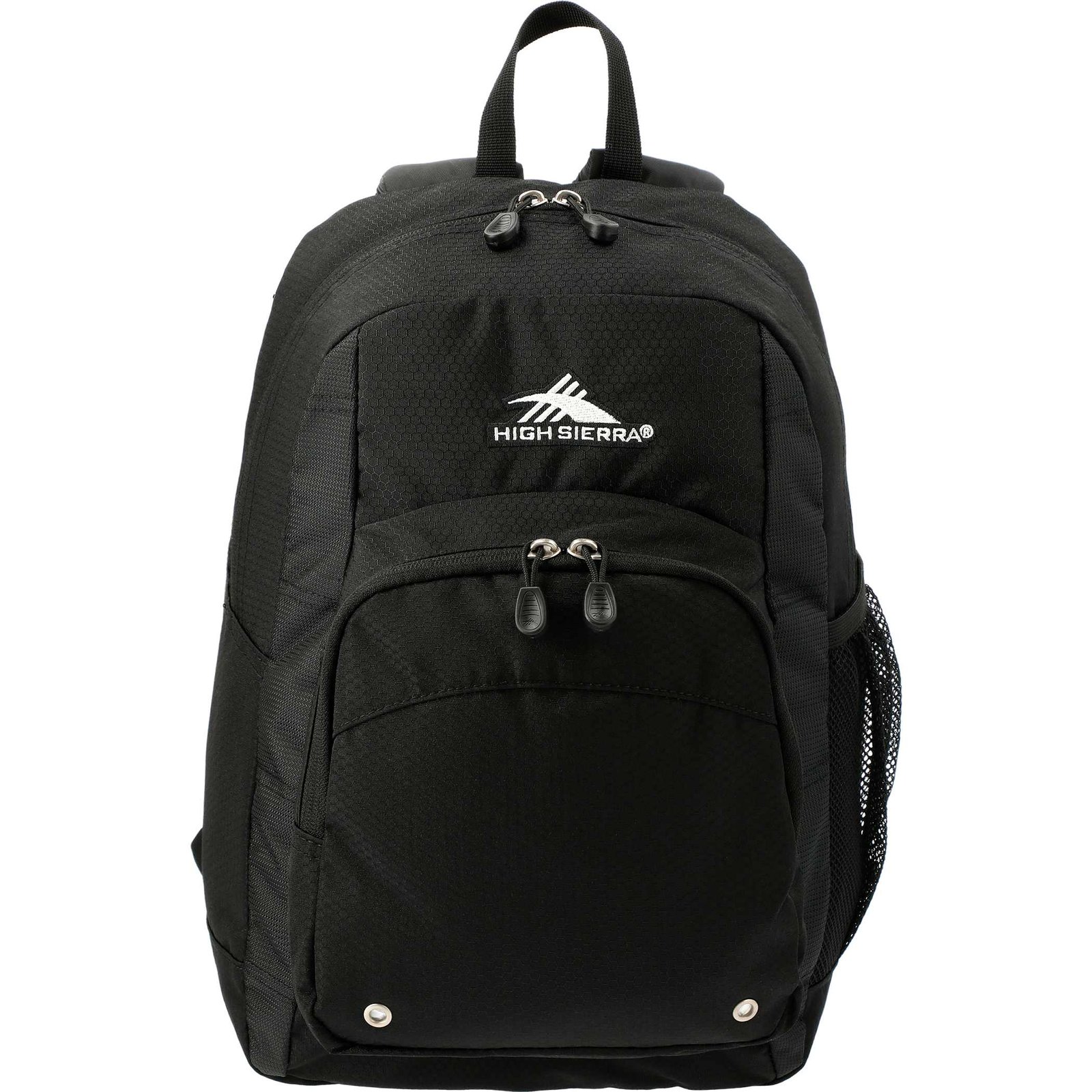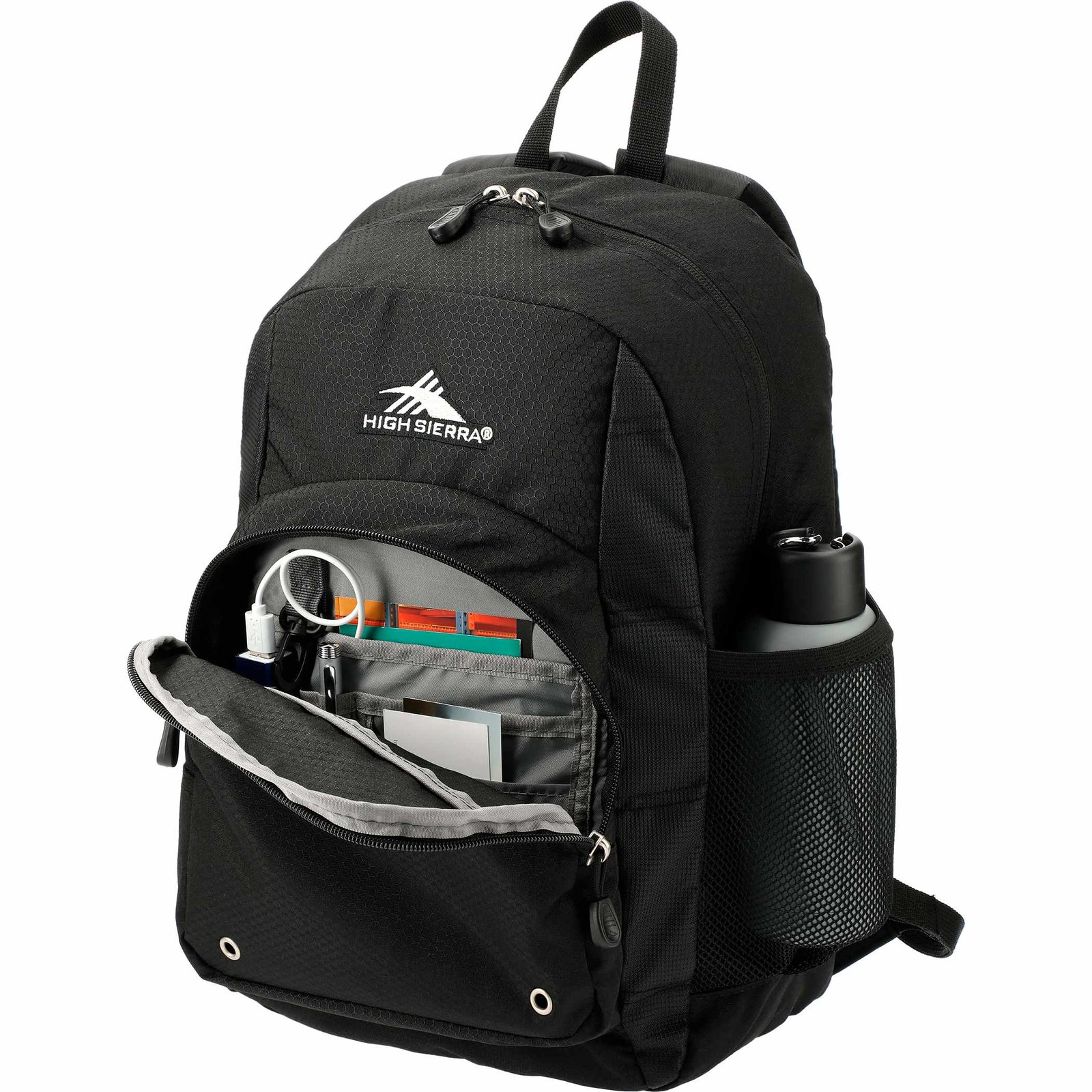 Constructed from a durable blend of poly and Duralite, the High Sierra Impact Backpack features a spacious front-loading main compartment. It also includes a large gusseted front pocket for additional accessories, a cell phone pocket, and a mesh water bottle pocket, plus a handy organizer with pen pockets and a key fob. The backpack has contoured, padded shoulder straps and a cushioned back panel for comfortable wear, along with a grab-handle for carrying.