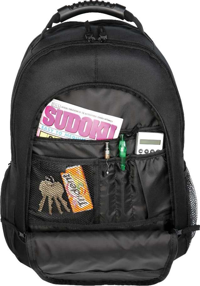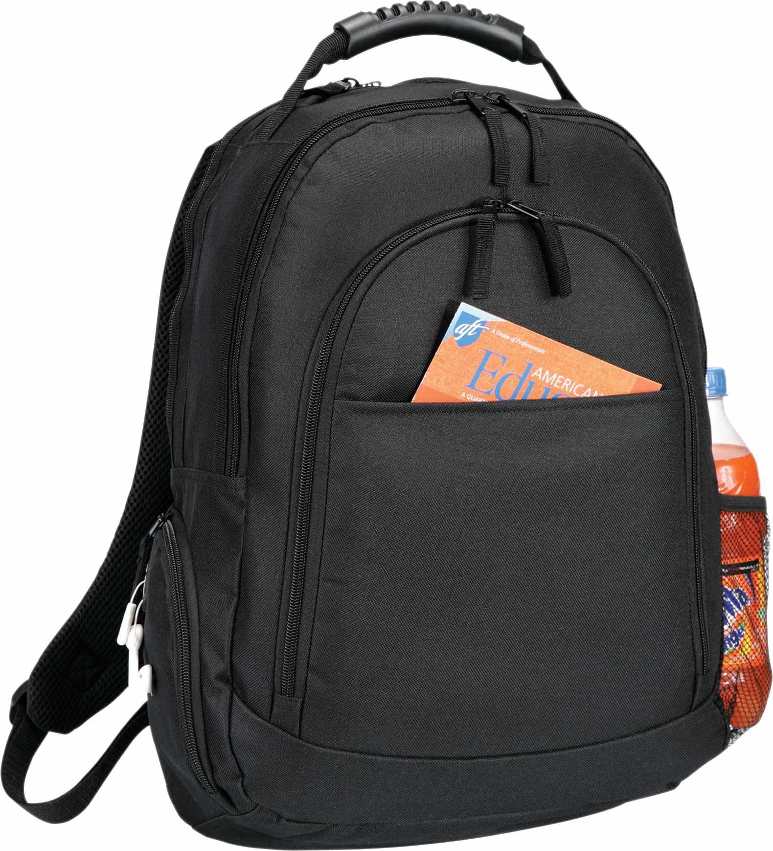 The Journey 15″ Computer Backpack is constructed from durable PolyCanvas and is designed to provide you with ample on-the-go storage. It includes two zippered main compartments, plus a rear compartment containing a padded 15″ laptop sleeve secured by a hook-and-loop closure. The Journey 15″ also features a zippered front pocket, which includes a deluxe organization panel with multiple pockets inside. You’ll also find a side mesh pocket for your water bottle, along with a handy media pocket and earbud port. With a reinforced, heavy-duty, rubber-trimmed handle, this rugged bag is easy to carry anywhere. Key Features Material: 600D PolyCanvas Dual zippered main compartments Rear compartment with padded 15″ laptop sleeve Zippered front pocket Deluxe multi-pocket organizer panel Side mesh water bottle pocket Dedicated media pocket with earbud port Heavy-duty reinforced rubber carry-handle