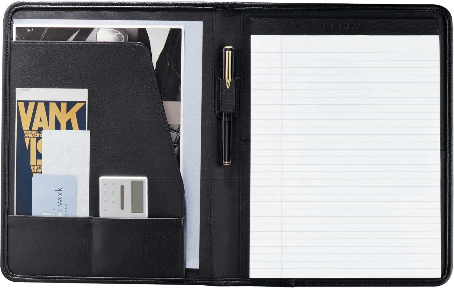 Record your important notes and ideas using the Manhattan Writing Pad with FSC® Mix Paper, which features genuine pebble grain leather construction. It offers a front slot pocket, a convenient pen loop, and an interior organizer with a folder for your documents. Pen not included. The FSC® Mix writing pad measures 11.0” H x 8.5” W and has a refillable design. Paper refills are available to order separately (9091-01), along with a wide assortment of pens. Key Features Material: Genuine pebble grain leather Writing pad measures 11.0” H x 8.5” W Interior organizer with document folder Slot-style front pocket for added storage Built-in pen loop Paper refills available to order separately