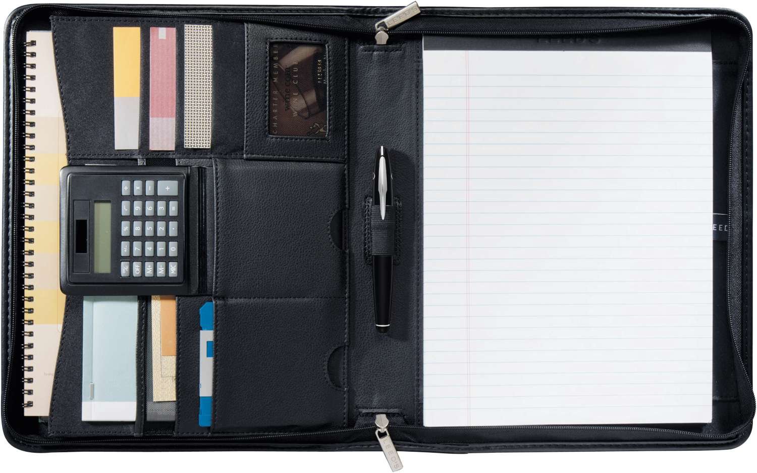 With genuine pebble grain leather construction, the Manhattan Zippered Padfolio with FSC® Mix Paper provides a luxurious portable storage solution for all your school and business essentials. It unzips to reveal an interior organizer with a gusseted file pocket, multiple holders for your business cards, and a convenient pen loop. The padfolio also comes with a refillable 11.0” H x 8.5” W FSC® Mix writing pad, with refills available to order separately (9091-01).