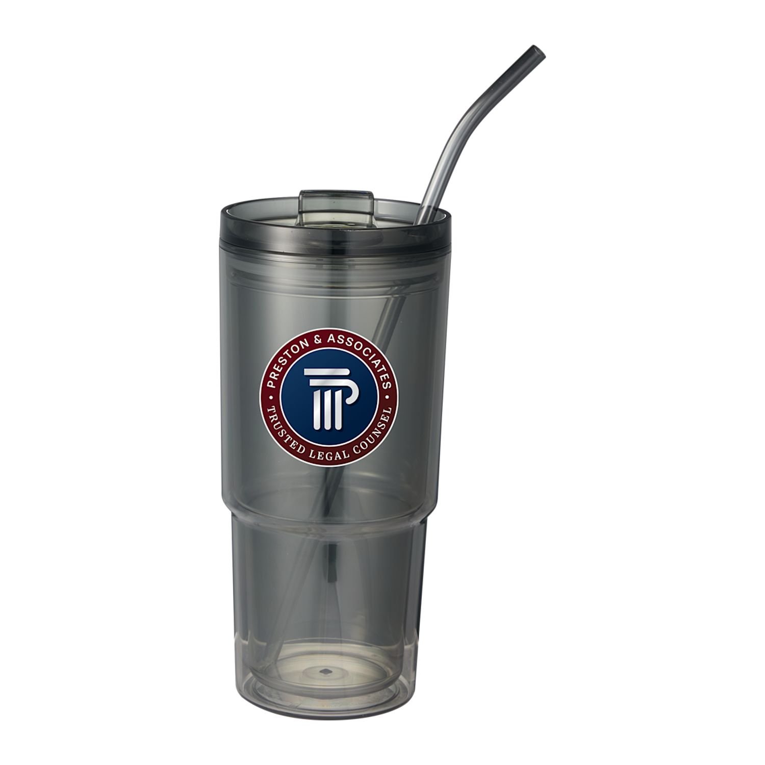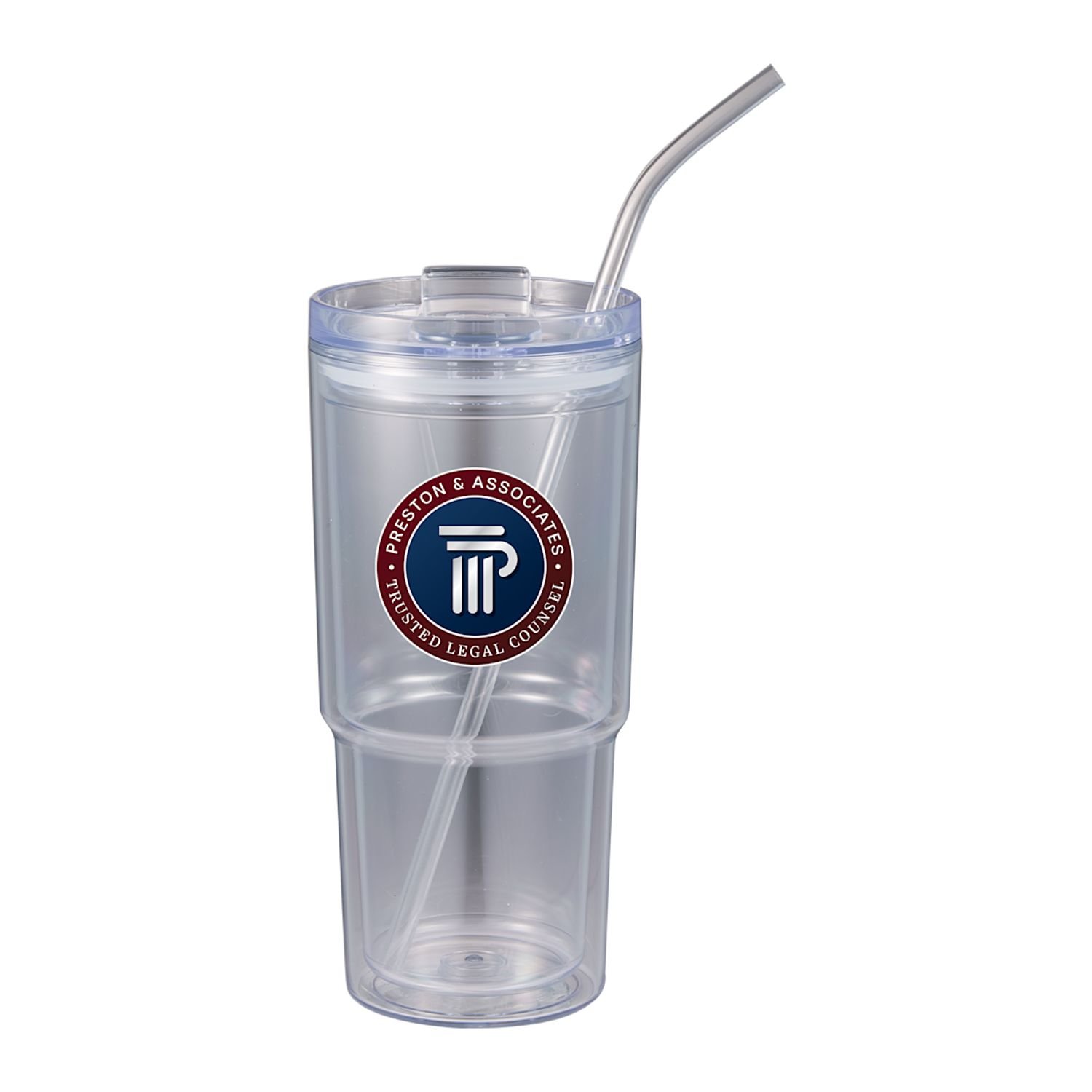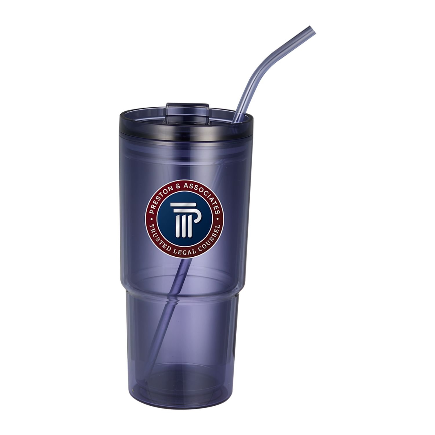 The Mia 24 oz Acrylic Tumbler combines style and sustainability, crafted from 100% recycled acrylic for an eco-conscious choice. Its durable double-wall construction keeps cold beverages refreshing and reduces condensation, making it perfect for everyday use. The tumbler includes a color-matching angled straw and a swivel lid closure for secure transport when not in use. With a slim design that fits standard cup holders, the Mia Tumbler is convenient for on-the-go hydration. Hand wash only.