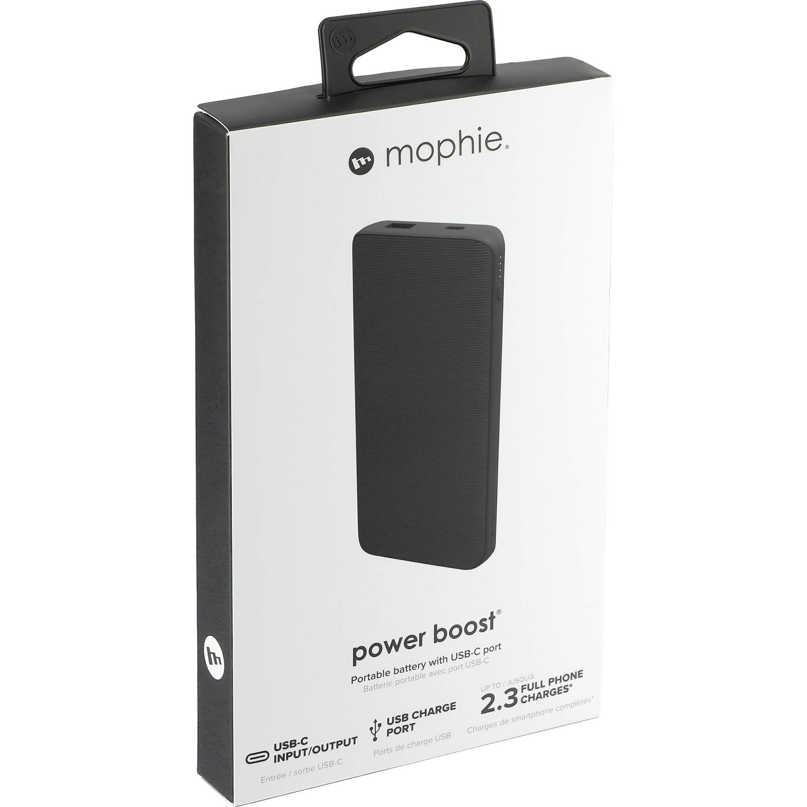 The mophie® Power Boost 10,000 mAh Power Bank has a rechargeable lithium polymer battery (37Wh) that can charge two electronic devices at the same time with one Type-C and one USB-A output ports. Included USB-A-to-Type-C cable. Packaged in a premium gift box. Power banks are permitted in carry-on luggage only, and at the discretion of TSA agents. Please charge power bank before initial use.