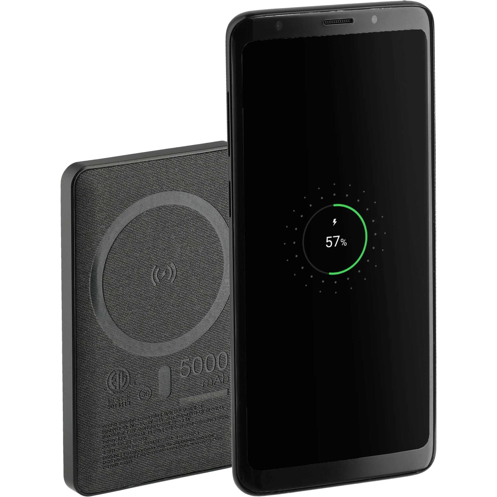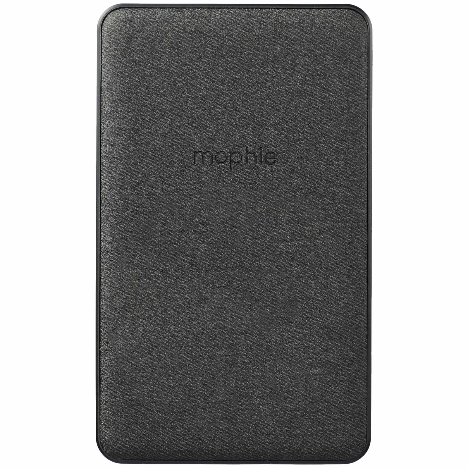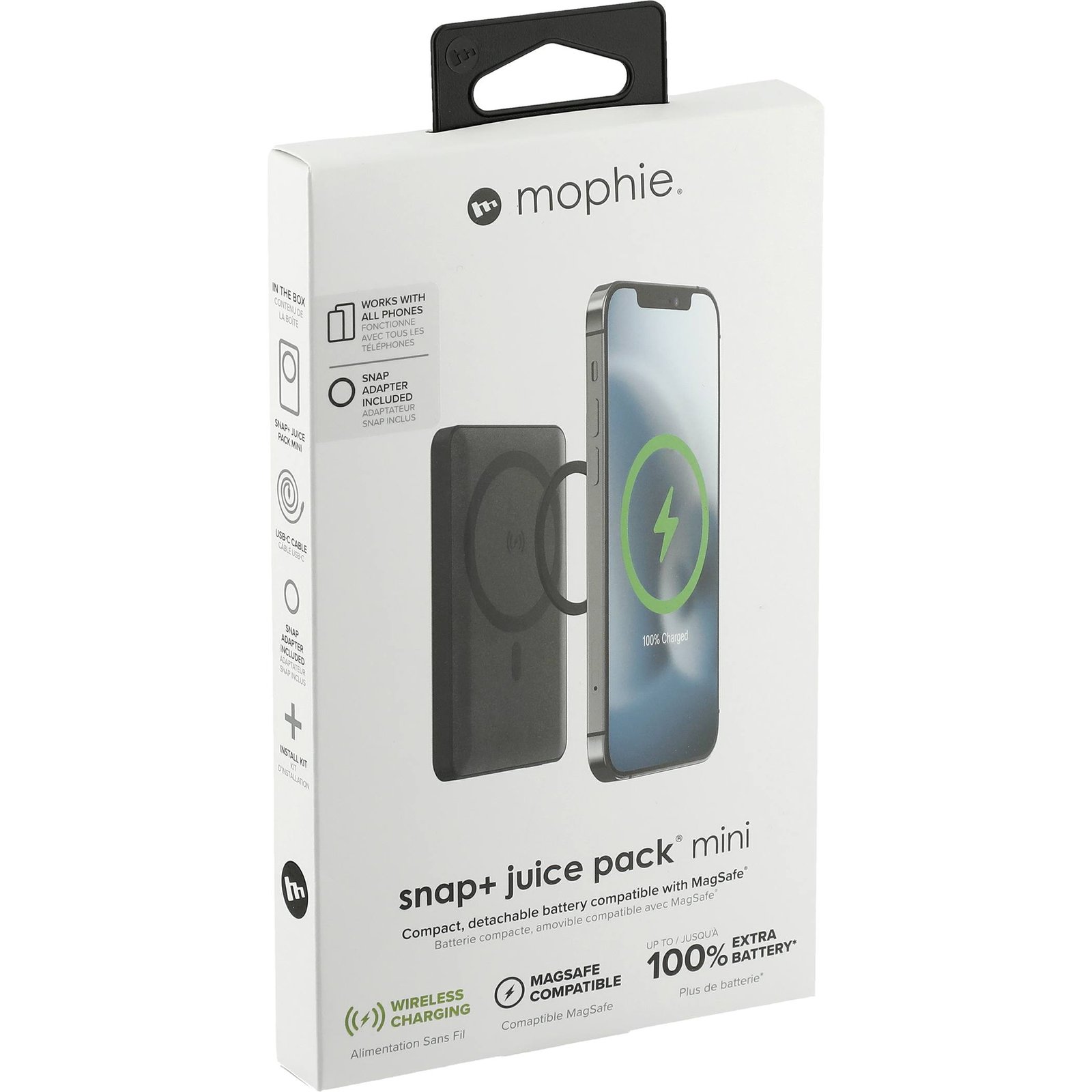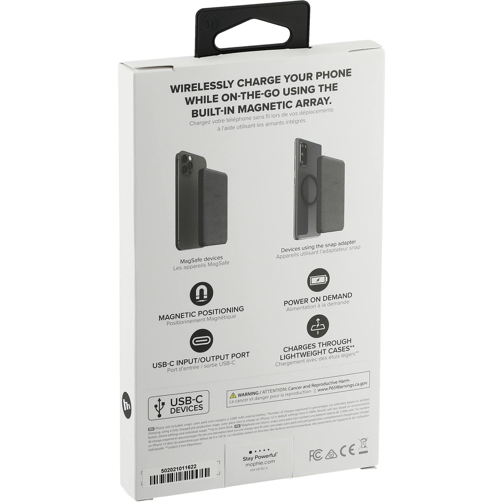 The mophie® Snap+ 5000 mAh Wireless Power Bank has a rechargeable lithium polymer battery (18.5Wh) that works as a charging pad or a regular power bank on the go. The inside magnetic hold ensures accurate placement for iPhone 12/13/14/15 series. The included snap adapter can easily attach to the back of a non-MagSafe compatible iPhone or any other smartphones. The Type-C port is compatible as an input and output for charge and discharge. USB-A-to-Type-C cable included. Works with most plastic phone cases on. Packaged in a premium gift box. Power banks are permitted in carry-on luggage only, and at the discretion of TSA agents. Please charge power bank before initial use.