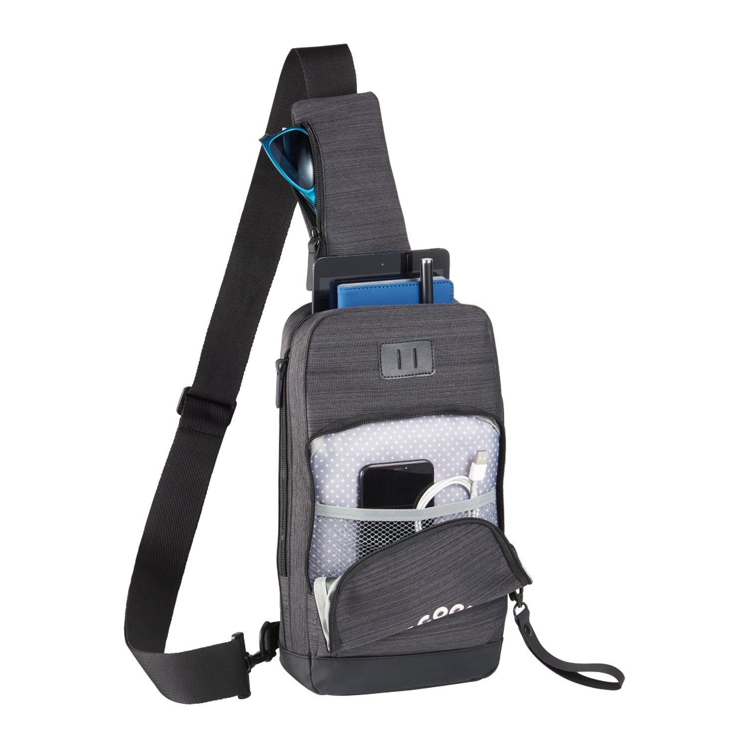 NBN stands for ”No Brand Needed.”The NBN Whitby Sling with USB Port includes an internal organizer, an adjustable shoulder strap, and a front zippered pocket that’s big enough for your phone. This PolyCanvas sling includes a side USB port and cable for easy charging on the go. The bag’s oversized zipper pull is perfect for decorating with your logo, providing a unique way to showcase your brand. The NBN Whitby Sling with USB Port has a premium vinyl lash-tab and comes with custom, printed lining.