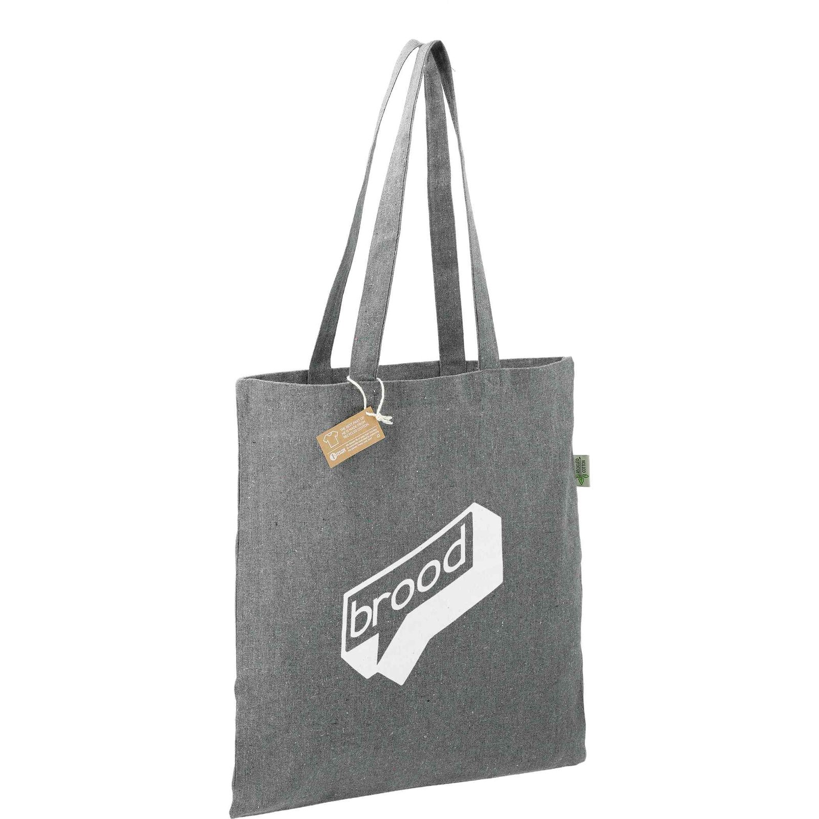 The Recycled Cotton Convention Tote is a truly unique way to show off your brand in a eco-friendly way. The material contains recycled cotton collected from garment cutting waste blended with recycled polyester to produce a strong reusable bag that will surely turn heads. Bag weight is 180g or 6.3oz. Through a partnership with 1% For The Planet, one percent of sales of this and all EcoSmart products will be donated to nonprofits dedicated to protecting the planet. Please note: due to the recycled nature of the main material, color variance will be evident from piece to piece. Key Features Material: 7 oz recycled cotton Open main compartment 12″ handle drop Size: 15.00 H x 16.50 W