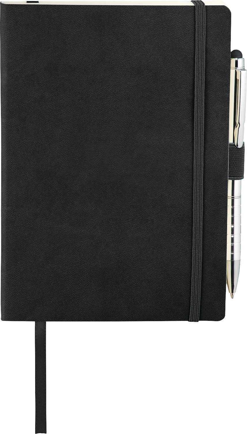 The Revello Soft Bound Journal Bundle Set includes one 5” x 7” Revello Soft Bound Journal (2700-67) and one Preston Dual Ballpoint Stylus (1065-08), bringing two classic essentials together. The included UltraHyde notebook has a document pocket on its interior back cover, contains 80 sheets of cream lined paper, and shuts with a built-in elastic closure. The journal also contains an integrated pen loop and ribbon page marker. The included stylus is eligible for free laser set-up. Key Features Material: Italian UltraHyde Includes 1 notebook and 1 ballpoint pen/stylus 80 lined sheets of cream paper Built-in page marker and pen loop Storage pocket inside rear cover Stylus qualifies for free laser set-up