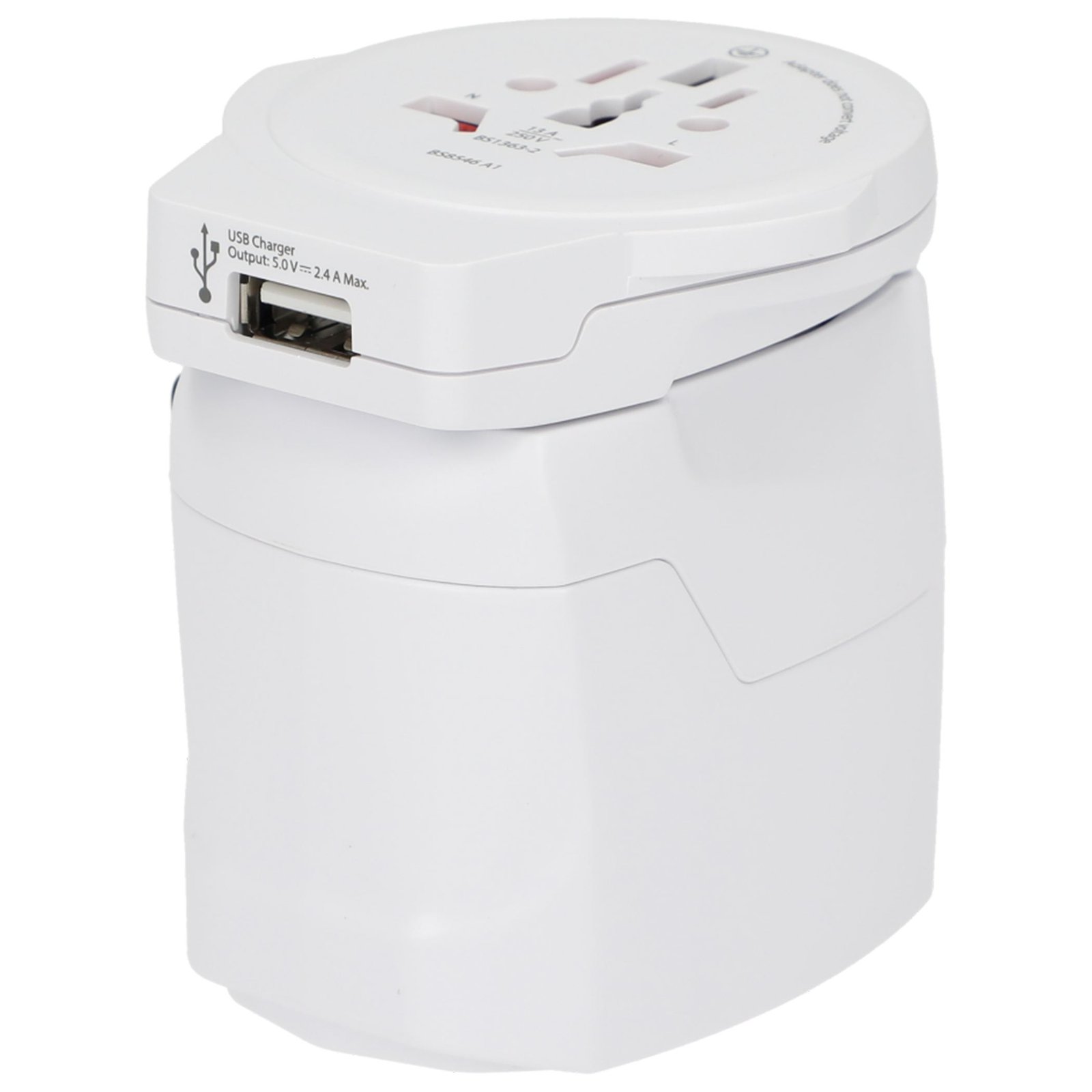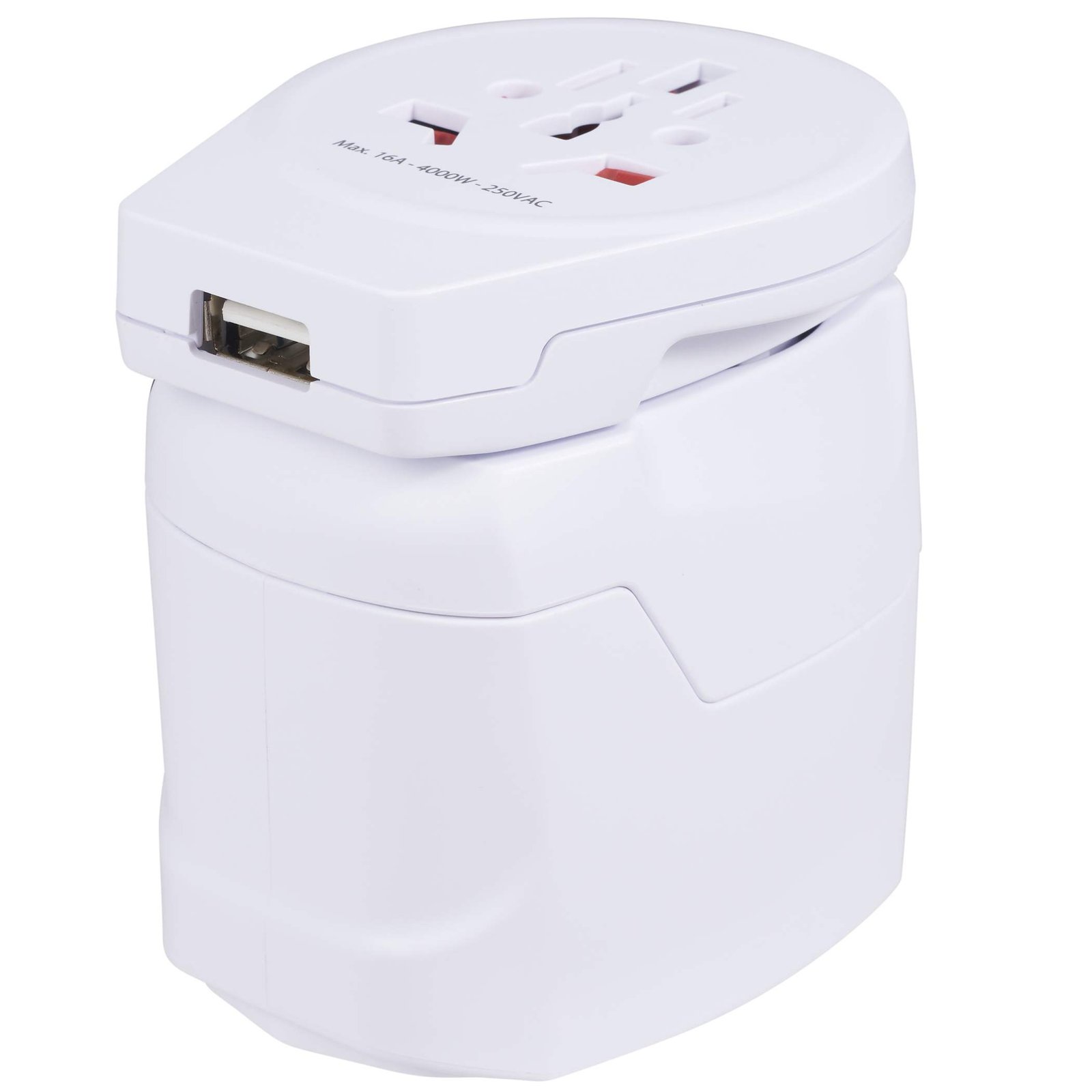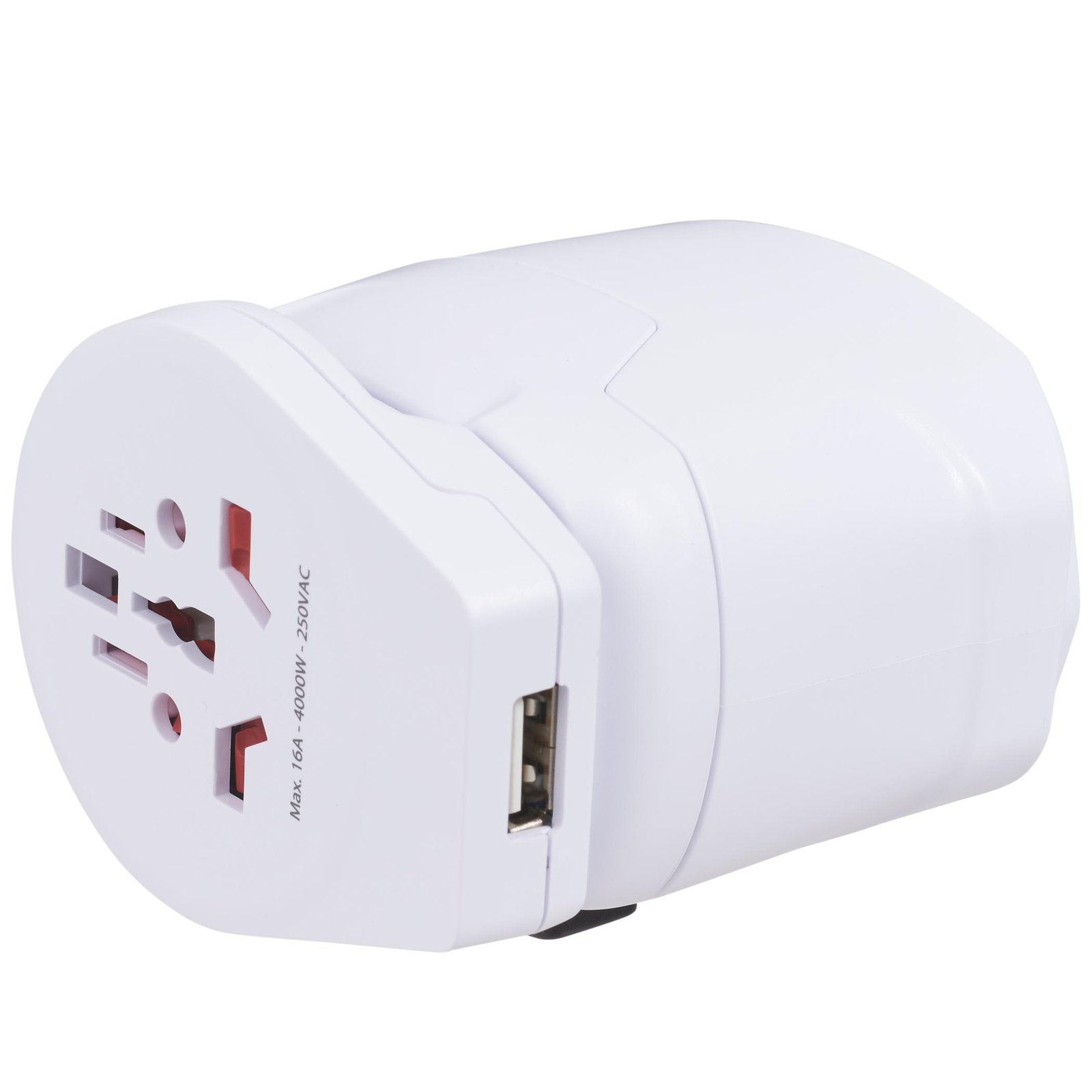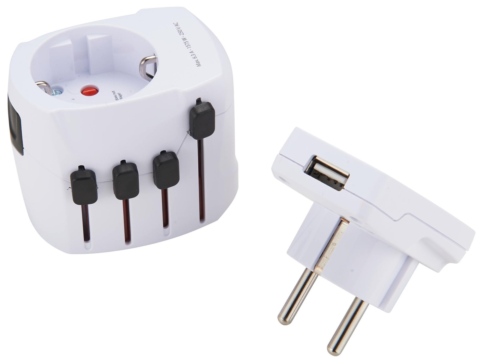 - 3-pole travel plug with integrated USB charger