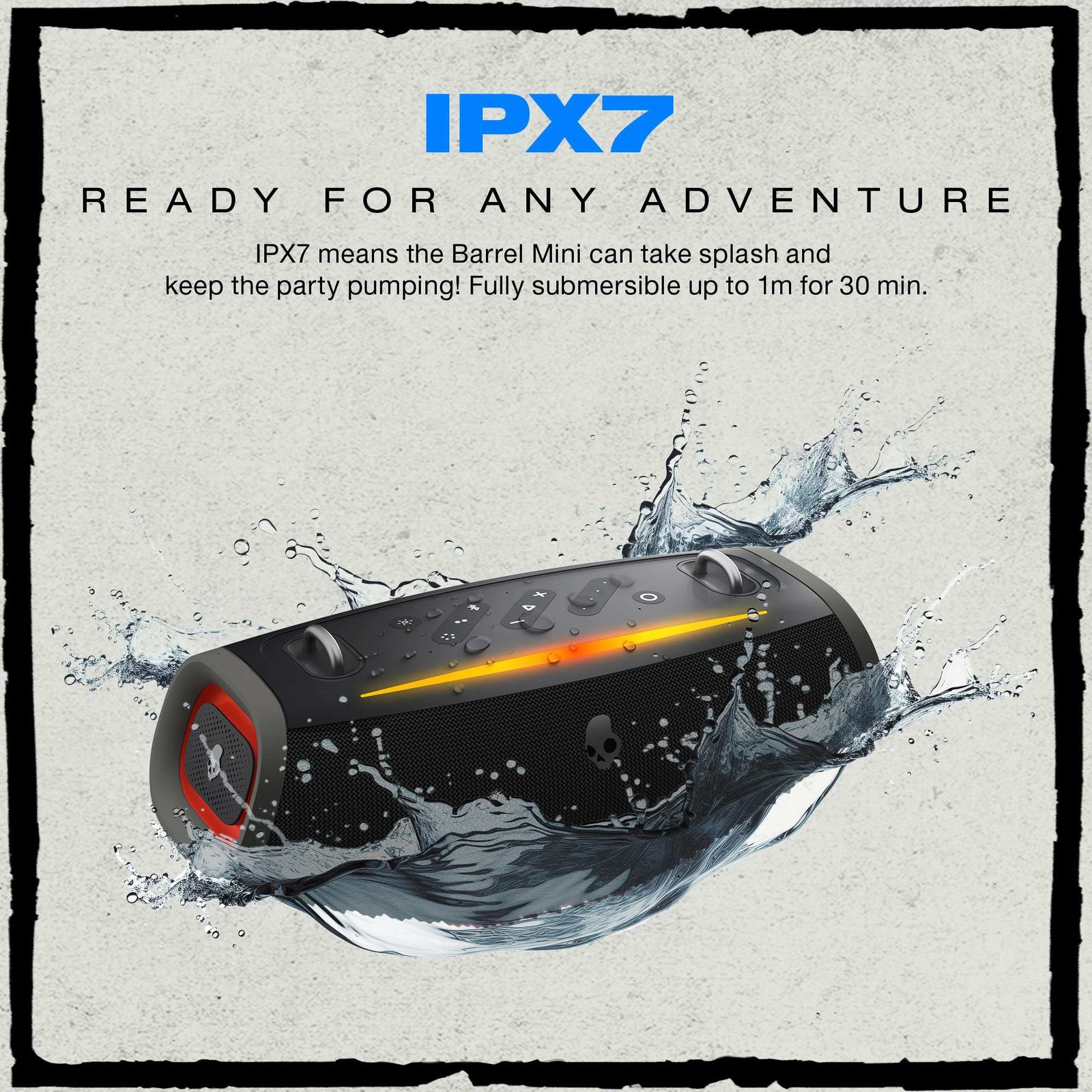 The Skullcandy Barrell Mini is the ultimate portable Bluetooth speaker. With built-in custom dual passive radiators, it will provide maximum bass for your audience. If the sound doesn’t get their attention, the LED Lights will mesmerize the crowd with a dazzling, dynamic light show. With up to 12 hours of playback time, you’ll enjoy the audio from sunrise to sunset. With an IPX7 waterproof rating, the speaker is perfect for camping, traveling, and other outdoor adventures. The speaker includes three built-in microphones, music controls, and a 30W USB-C Power Bank. SKDY Multi-Link allows you to connect to 99 Skullcandy Multi-Link speakers. Key Features Dual passive radiators – Delivers rich, powerful bass in a compact form Dynamic LED light show – Built-in lights pulse to the beat for immersive visual effects Up to 12 hours of playtime – Long-lasting power for day-to-night listening IPX7 waterproof rating – Withstands full water immersion up to 3 feet for 30 minutes Multi-Link connectivity – Pair up to 99 compatible Skullcandy speakers 30W USB-C power bank – Doubles as a charger for phones and devices Built-in music controls – Easily manage volume, playback, and tracks 3 integrated microphones – Hands-free calling and voice assistant support Compact and rugged – Perfect for travel, outdoor use, or everyday carry