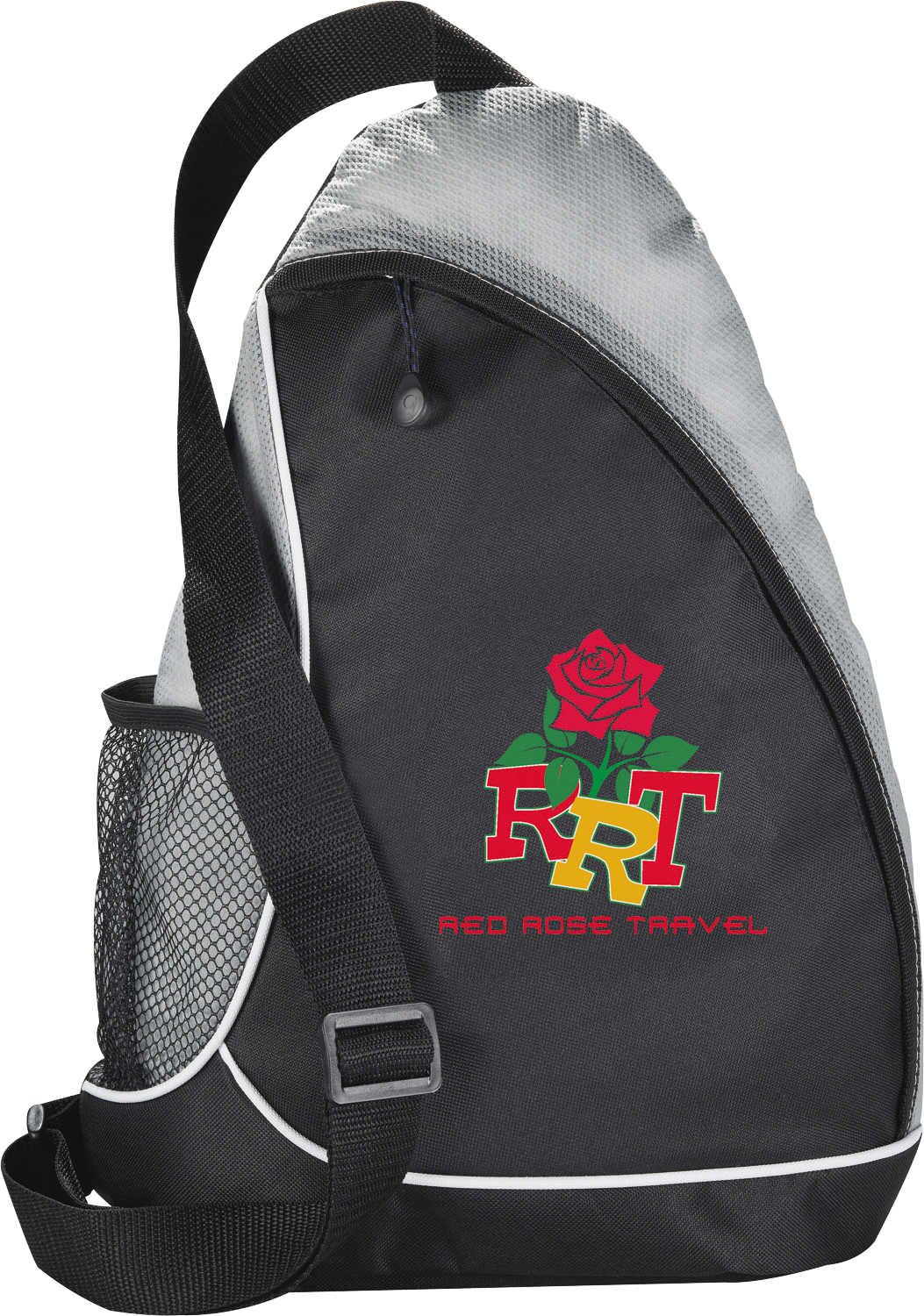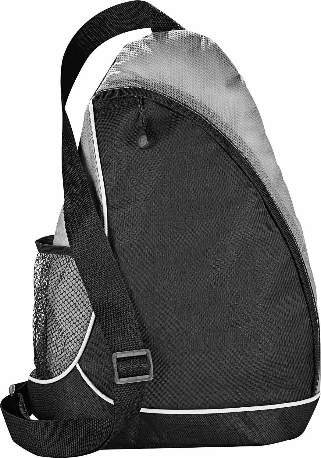 The Sling Shot Sling Backpack features a main zippered compartment, a side mesh water bottle pocket and an adjustable cross-over shoulder strap.