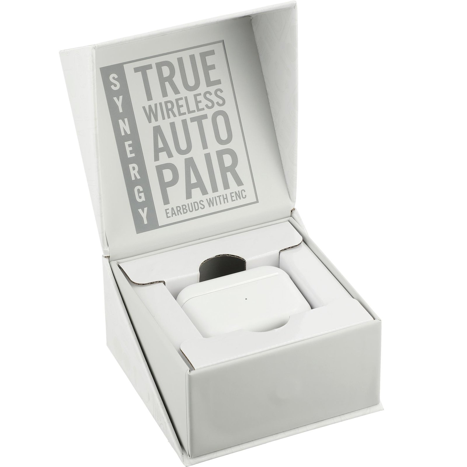 The Synergy True Wireless Auto Pair Earbuds with ENC feature the latest technology in audio. Once the case is opened, the earbuds will power on and automatically sync to one another. The case also doubles as a power bank for the earbuds and can be charged with the included Type-C cable. Once the 400mAh battery of the case is charged, it will charge the earbuds 4x from 0-100%. With over 4.5 hours of playback time at max volume on a single charge, they’re a must for any traveler or gamer. With built-in Environmental Noise Cancellation (ENC), the earbuds block out surrounding sounds and pick up only your voice when using them for calls or video games, making it easy for the other person to hear you. The earbuds have built-in music controls and dual microphones for hands-free operation. It takes 1.5 hours to fully charge the earbuds. The case can be charged in under 2 hours. Gaming mode: Low latency 70-75ms.