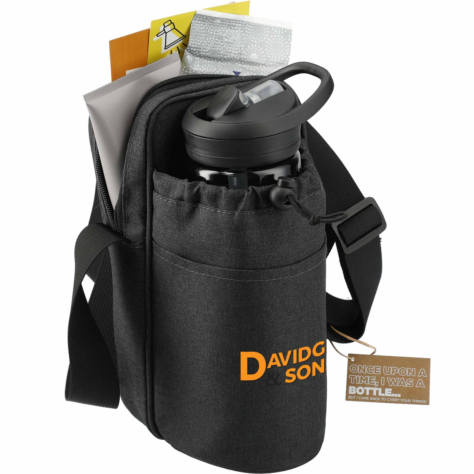 The Traver RPET Adjustable Bottle Sling Cooler w/ Pouch provides convenient, hands-free carrying for drinkware bottles. The insulated cooler liner helps keep your beverages cold while preventing condensation on sport bottles. An integrated toggle holds drinkware in place while inside the pouch. The zippered pocket features a built-in card organizer as well as elastic bands to store your accessories. Features an adjustable strap for on-the-go comfort. This product’s main material is RPET 600d and its black lining and webbing are RPET 210d, which is made from recycled plastics, such as water bottles. Note: PEVA lining of pouch is not made with recycled materials. Includes interior ID label. Disclaimer: There may be minor variations in color of the actual product due to the nature of the fabric dyes, weaves and printing. Bottle sold separately. The maximum diameter of the bottle that can be inserted into the bottle holder is 3.5”. Through a partnership with 1% For The Planet, one percent of sales of EcoSmart® products are donated to environmental nonprofits.