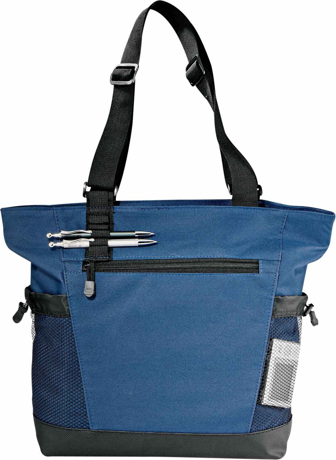 Great for tradeshows, conventions and business meetings. Zippered main compartment. Zippered front pocket.?Side mesh drawstring pockets. Pen loops. 15” handle drop height.