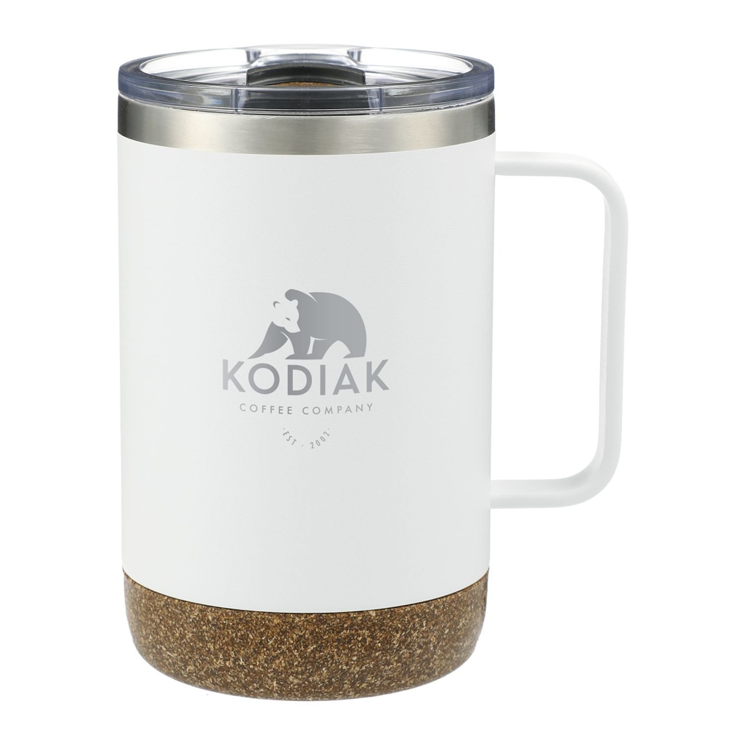 The Valhalla Copper Vacuum Insulated Camp Mug 14oz combines a classic camp mug design with a stylish and functional skid-proof synthetic cork base. Its durable double-wall stainless steel vacuum construction with copper insulation, allows your beverage to stay cold for up to 24 hours and at hot for up to 8 hours. The construction also prevents condensation on the outside of the piece. On-trend, durable powder coating. Its transparent push-on lid features a slide closure. 14oz. ***Cork color on lid slider & bottom base varies because of its natural feature.