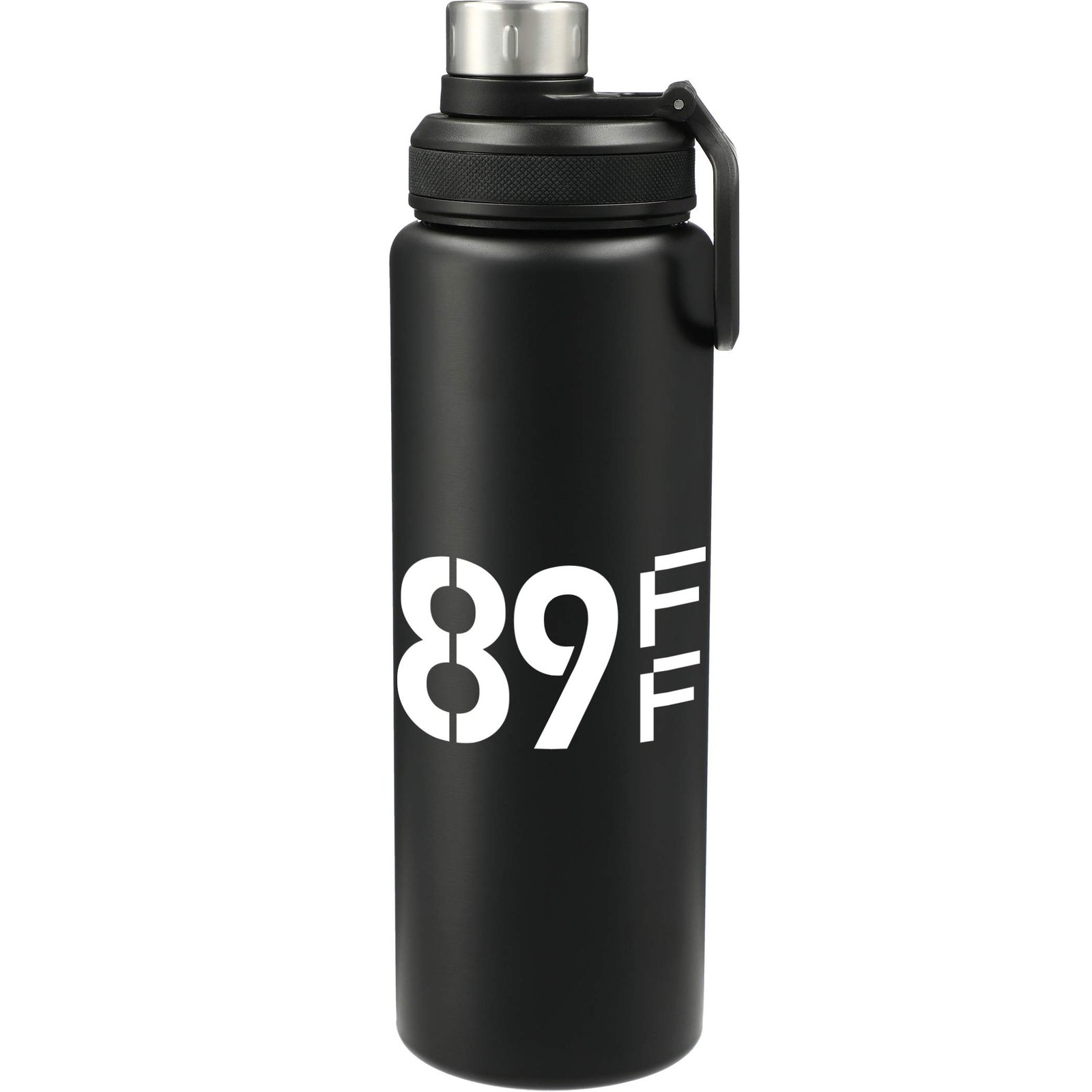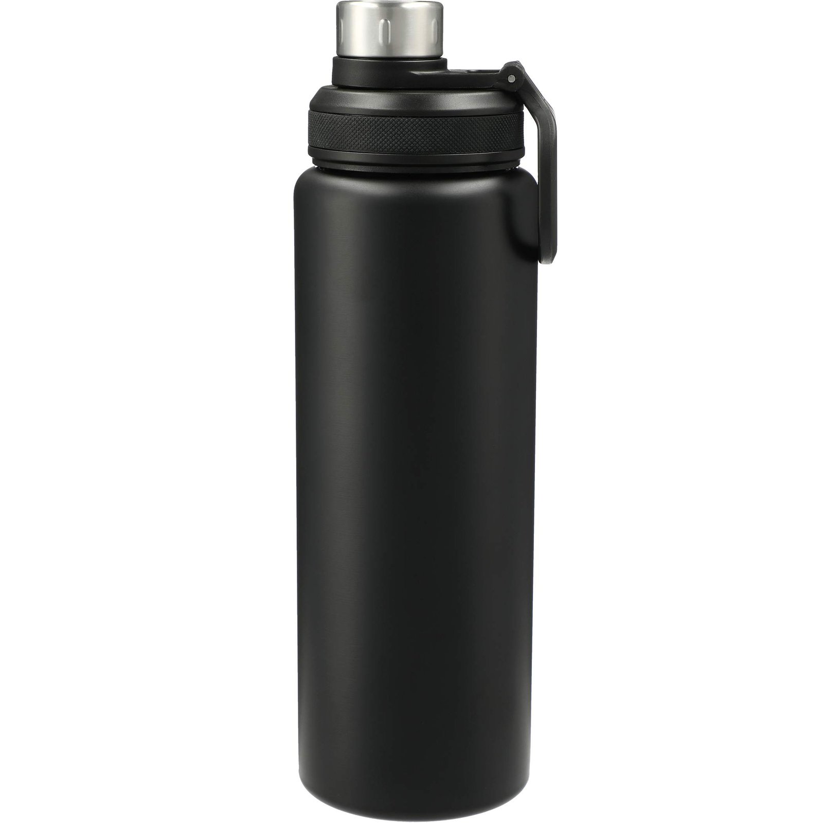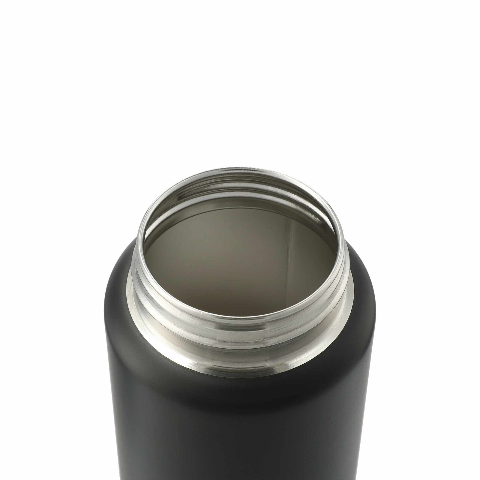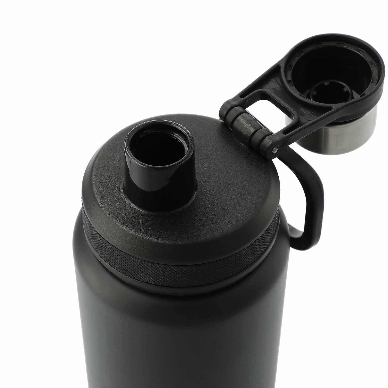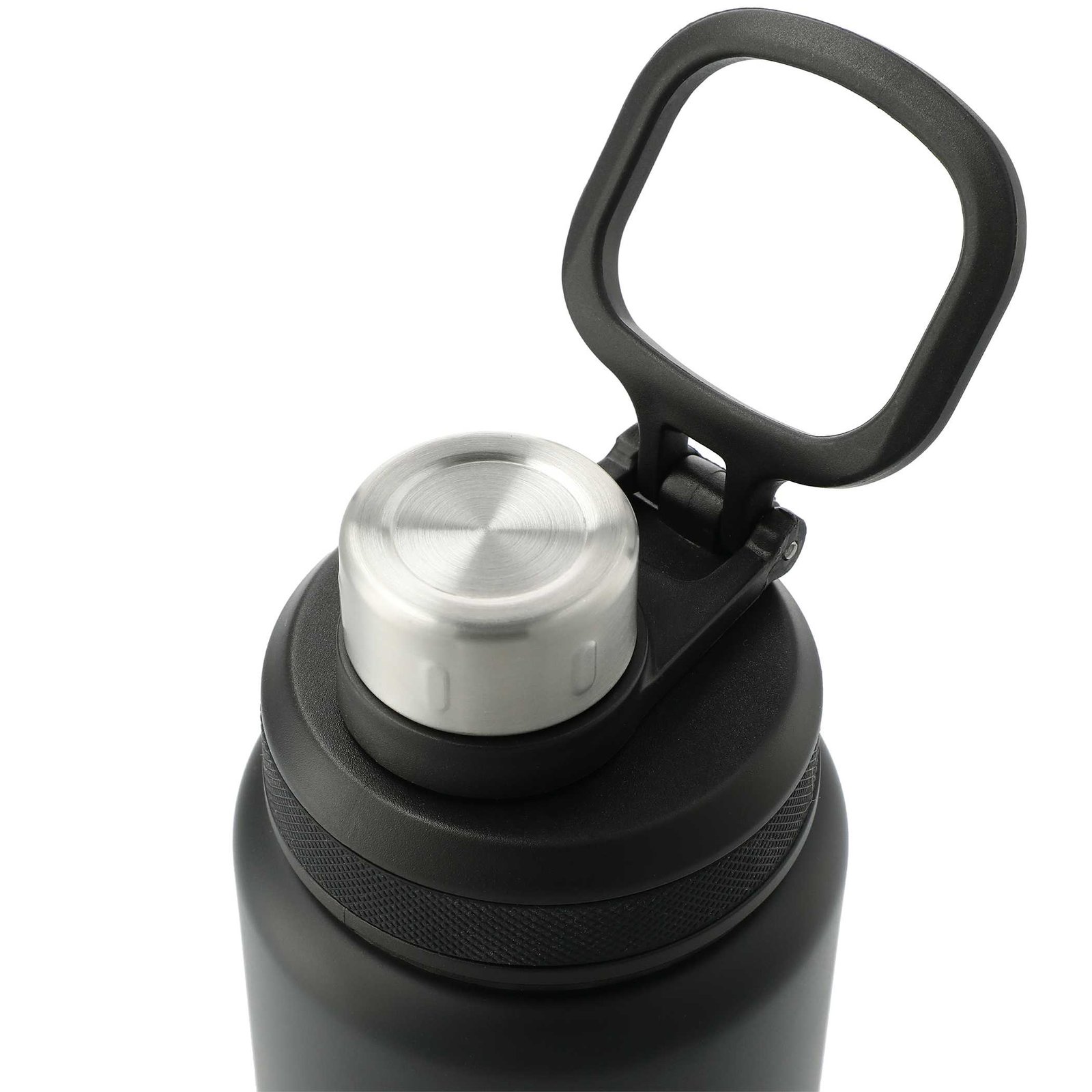 Durable, single-wall, stainless steel construction. On-trend matte coating. Dual opening, screw-on, stainless steel cap on the main lid with silicone band. Also features a built-in, durable, plastic handling loop. Wide opening for comfortable filling and pouring. Perfect for ice cubes. Fits most standard car cup holders. 32oz.