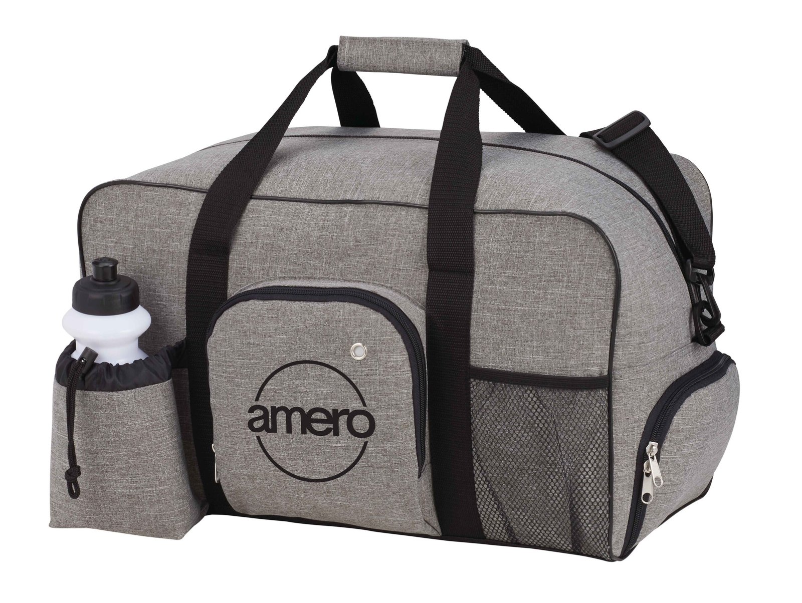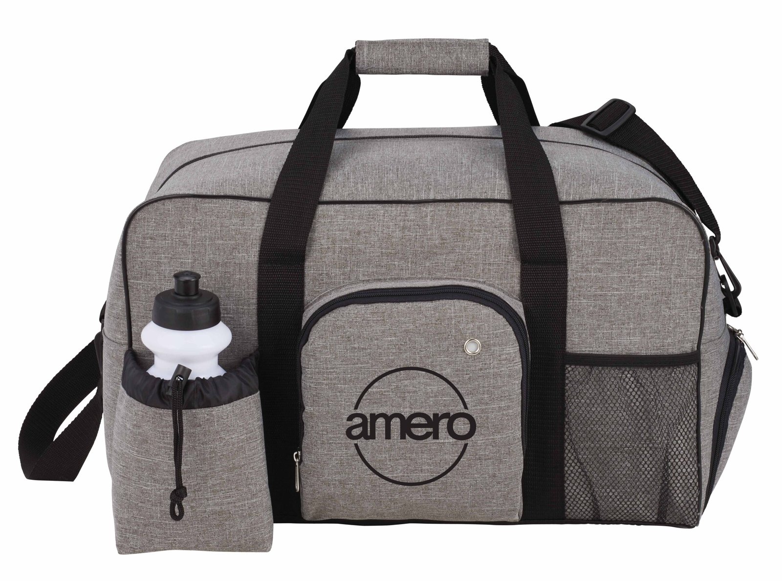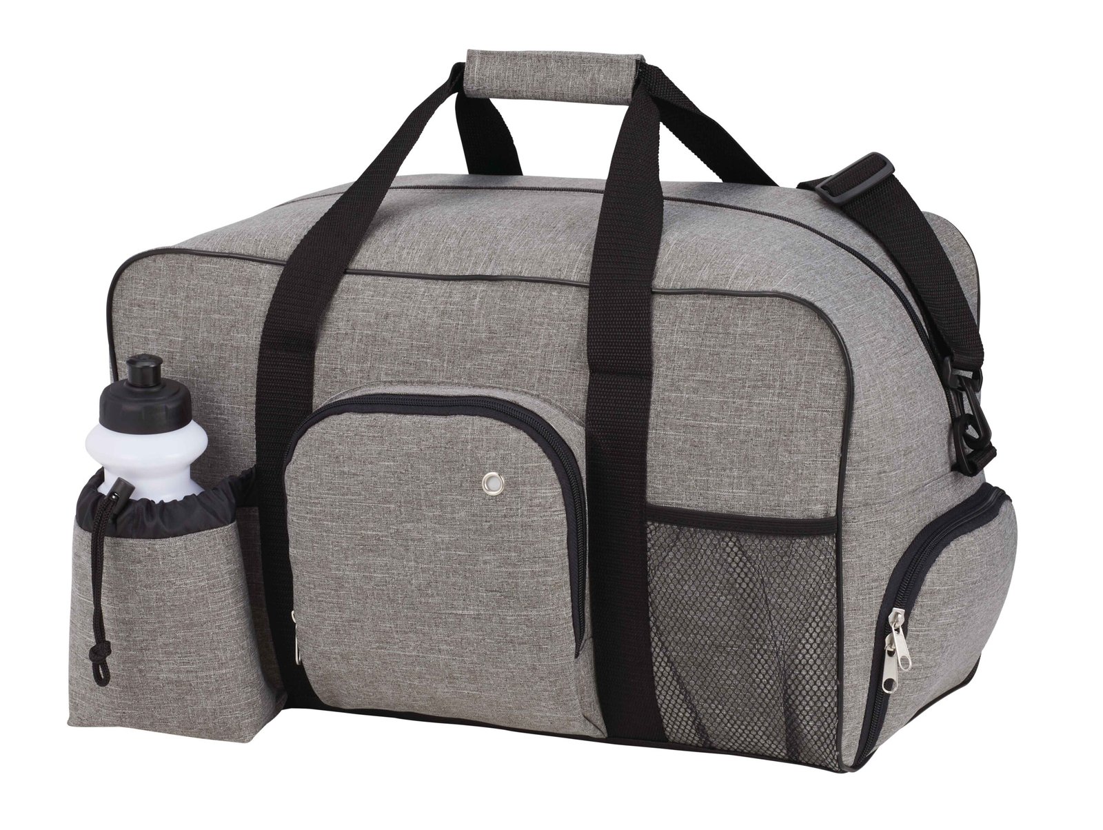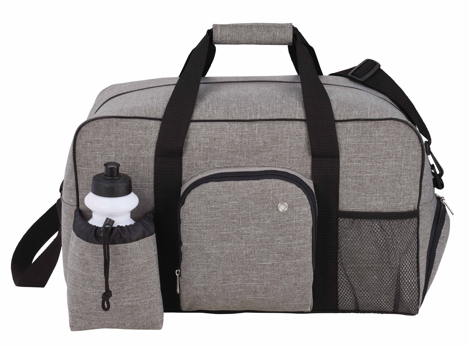 The Weekender 18.5″ Deluxe Duffel Bag features a zippered main compartment, zippered front media pocket with earbud port and a front mesh pocket and front pouch with an adjustable drawstring and squeeze-top water bottle (not imprinted). It also includes a zippered side shoe compartment and a secure bottom board for stability. The double 20.5-inch reinforced handles and detachable, adjustable shoulder strap make carrying simple and convenient. Key Features Material: 600d PolyCanvas Zippered main compartment Zippered front media pocket with earbud port Front mesh pocket Front pouch with adjustable drawstring Squeeze-top water bottle Zippered side shoe compartment Secure bottom board for stability 20.5″ reinforced drop handles Adjustable shoulder strap Available in a variety of colors