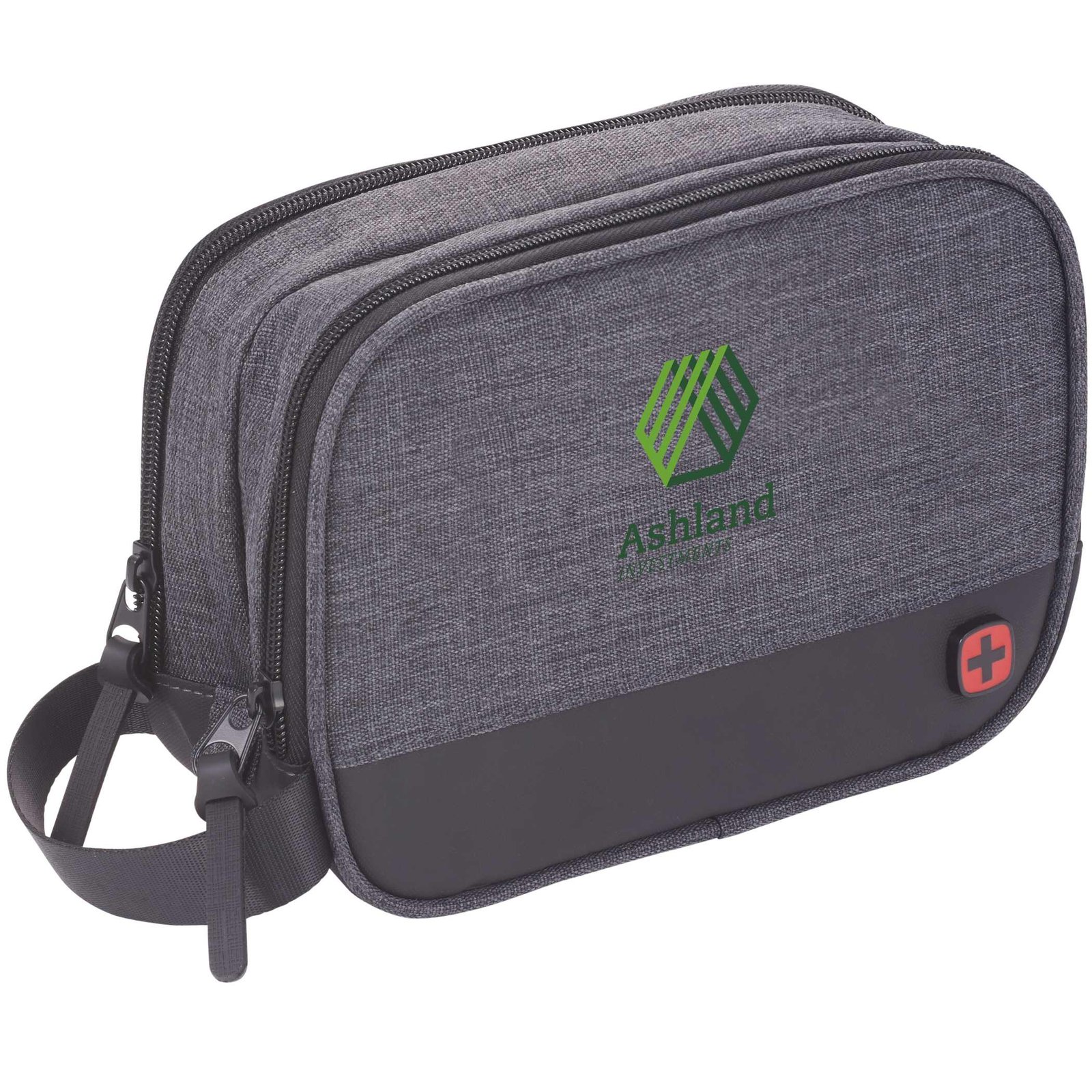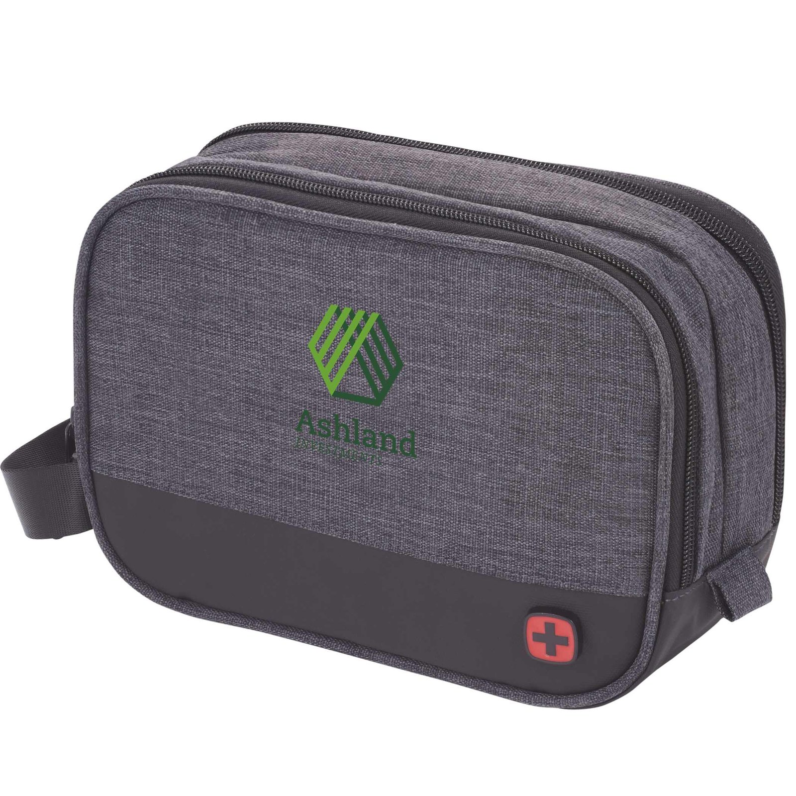 The Wenger RPET Dual Compartment Dopp Kit features two water-resistant compartments with organizational pockets to store toiletries, plus a webbed loop handle for grab-and- convenience.